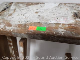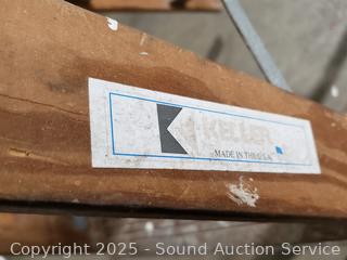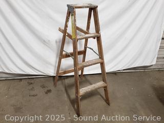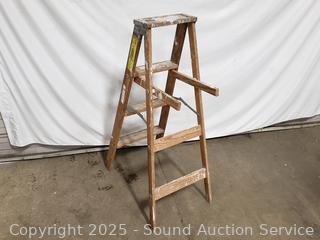 Lot #0105: 4ft Keller Wood Step Ladder, 3 Garden Tools & Grabber