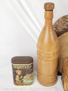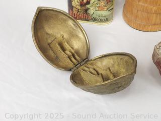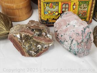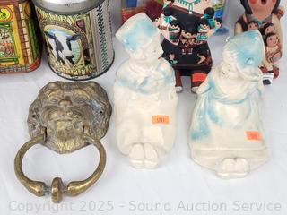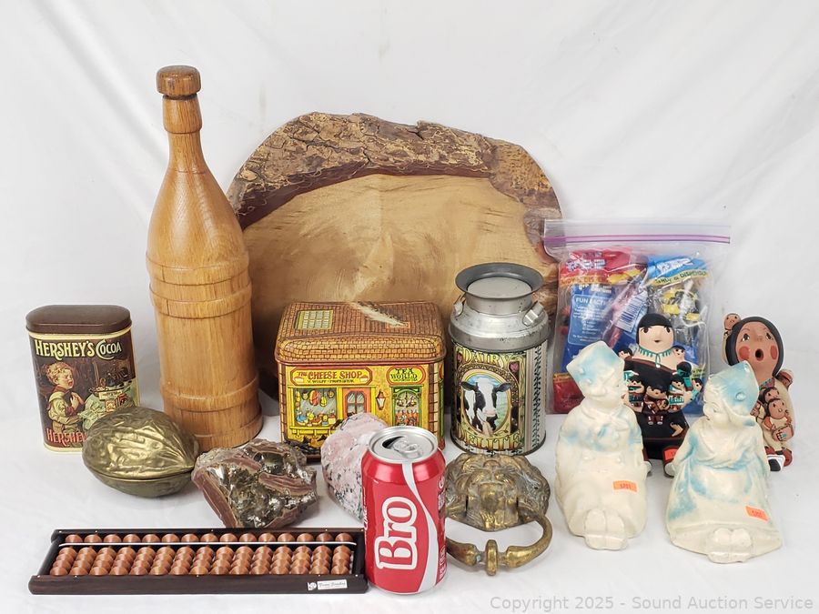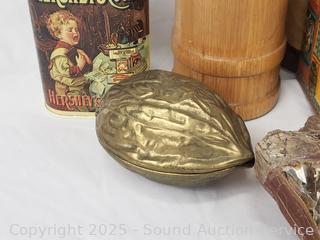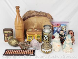 Collectible stones, Pez dispensers, tins, brass lionhead door knocker, wood bottle, etc. Refer to photos for lot contents, more details.