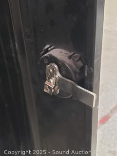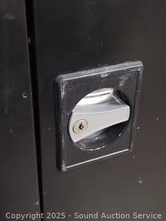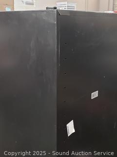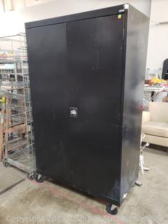 Locking, no keys, doors currently won't latch, latching rods are not attached. 78" H x 46" W x 24" D. Some scuffs, scratches throughout.