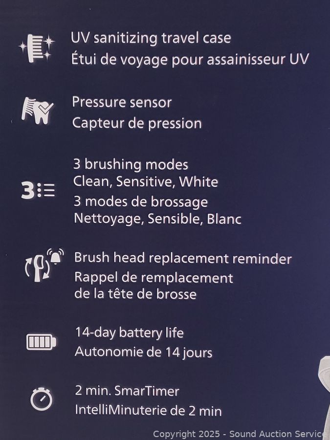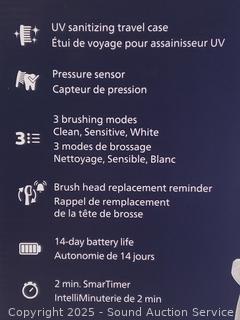 Appears sealed. 2 handles, 4 brush heads, 1 UV sanitizer case, 1 travel case, 2 chargers, 1 USB wall adapter.