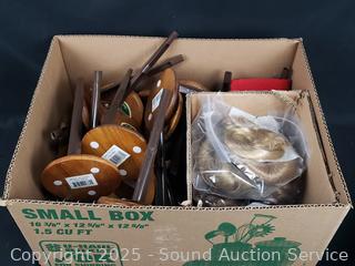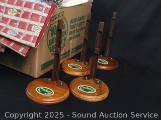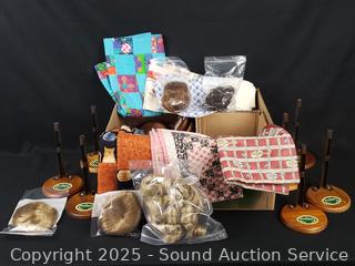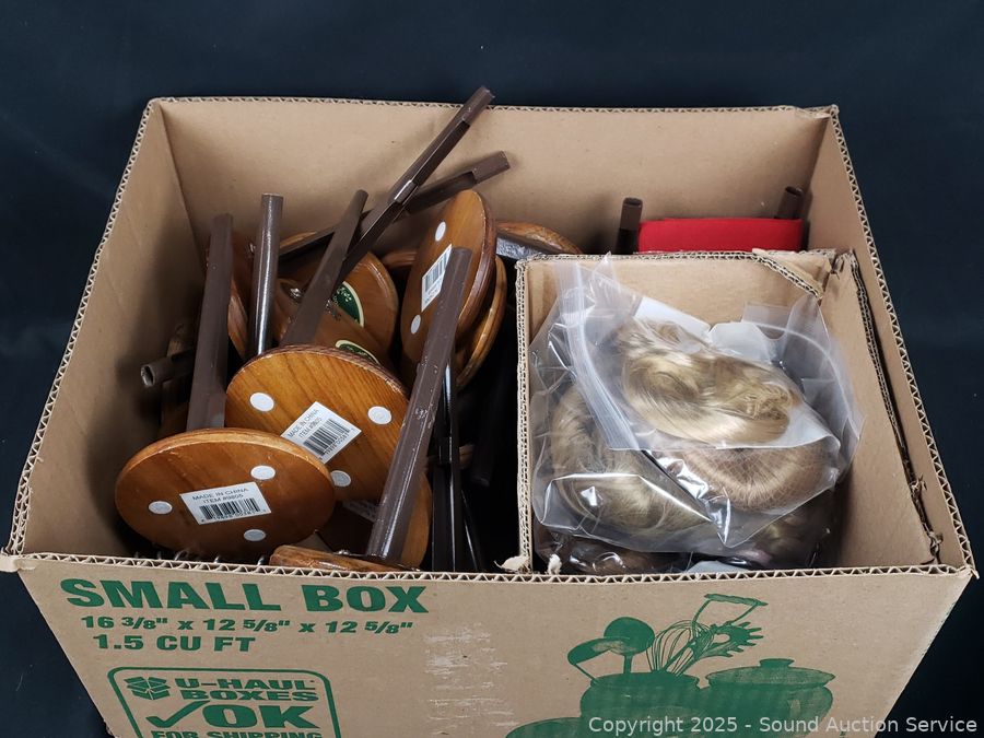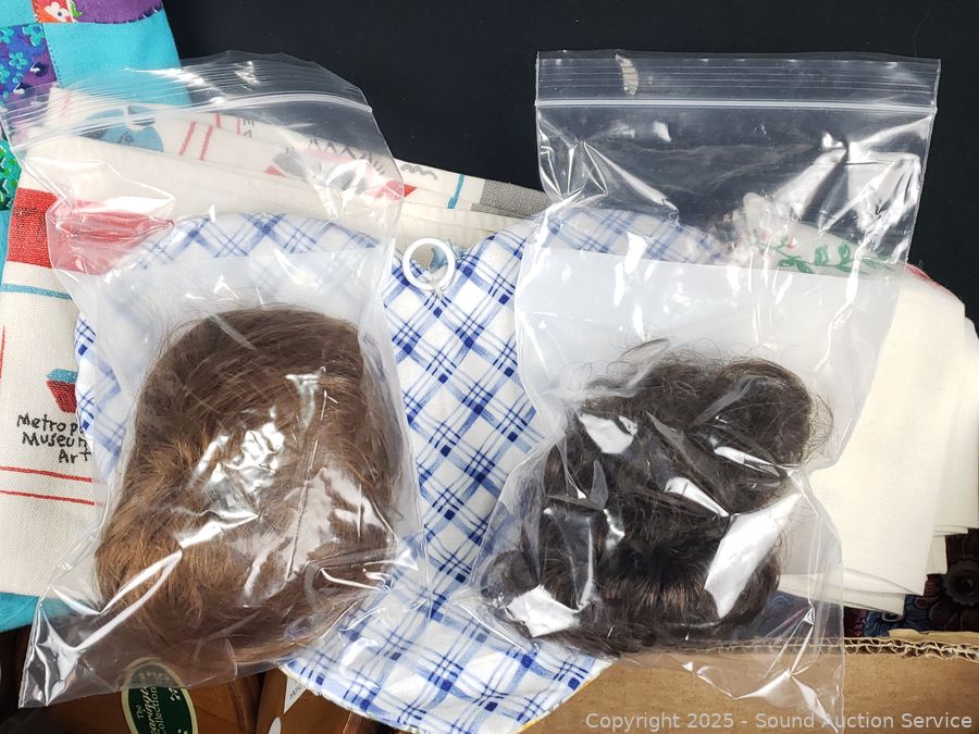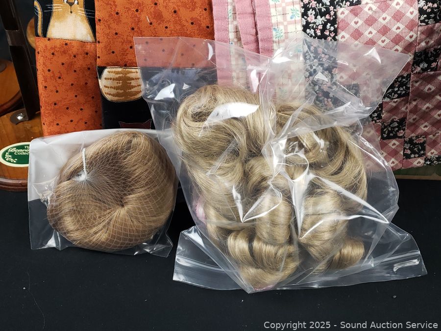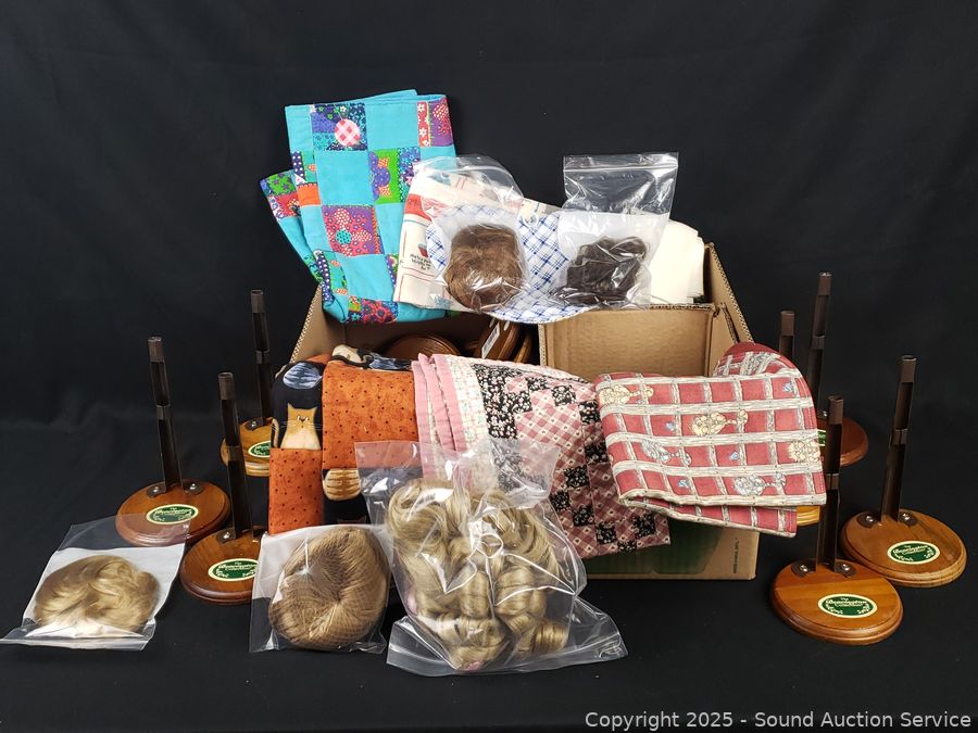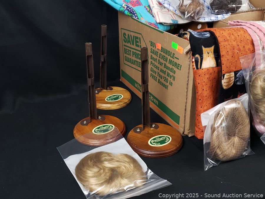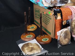 Lot #0273: Assorted Doll Stands, Hair Pieces, Doll Blankets