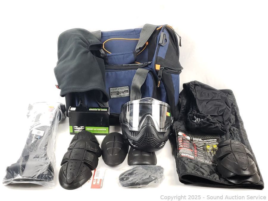 15" H x 10" x 10" athletic bag, Valken mask, Rider Handle Grip system, Oxford Vest, Rubber pads, Valken AC smart charger, etc. Refer to photos for more details.