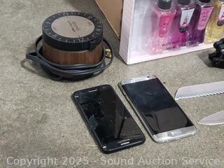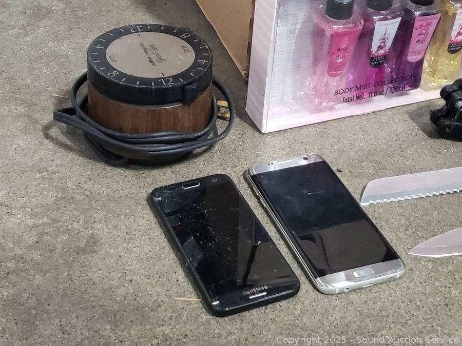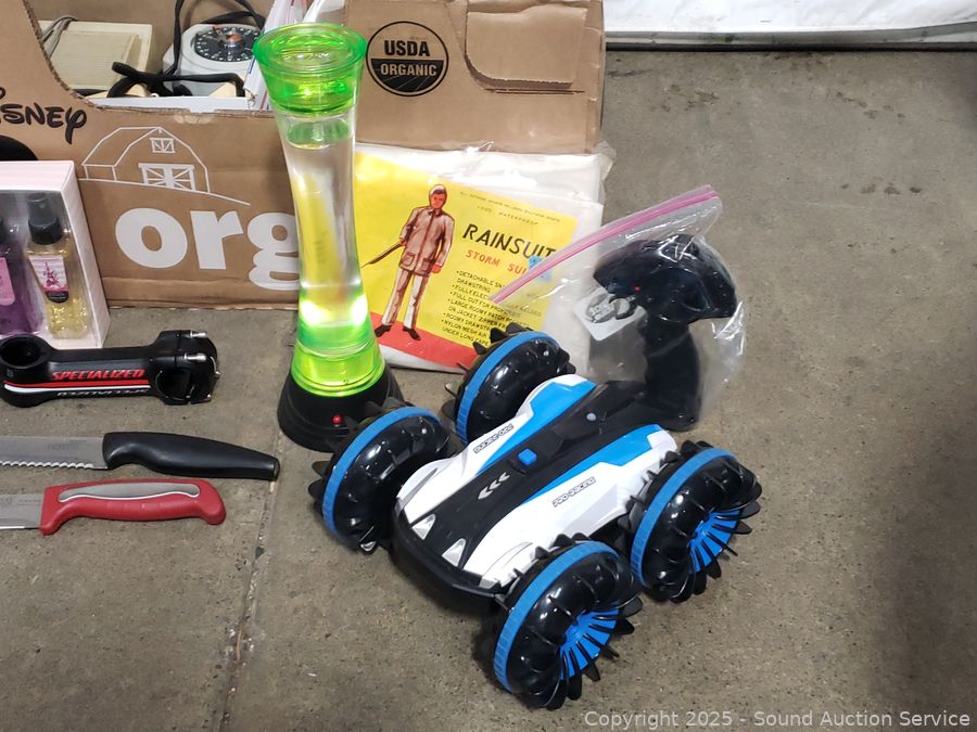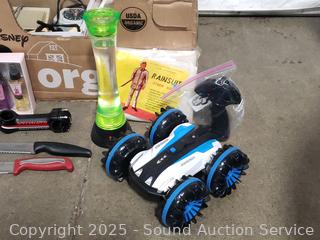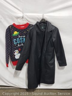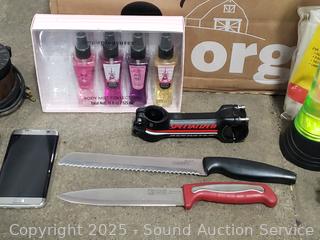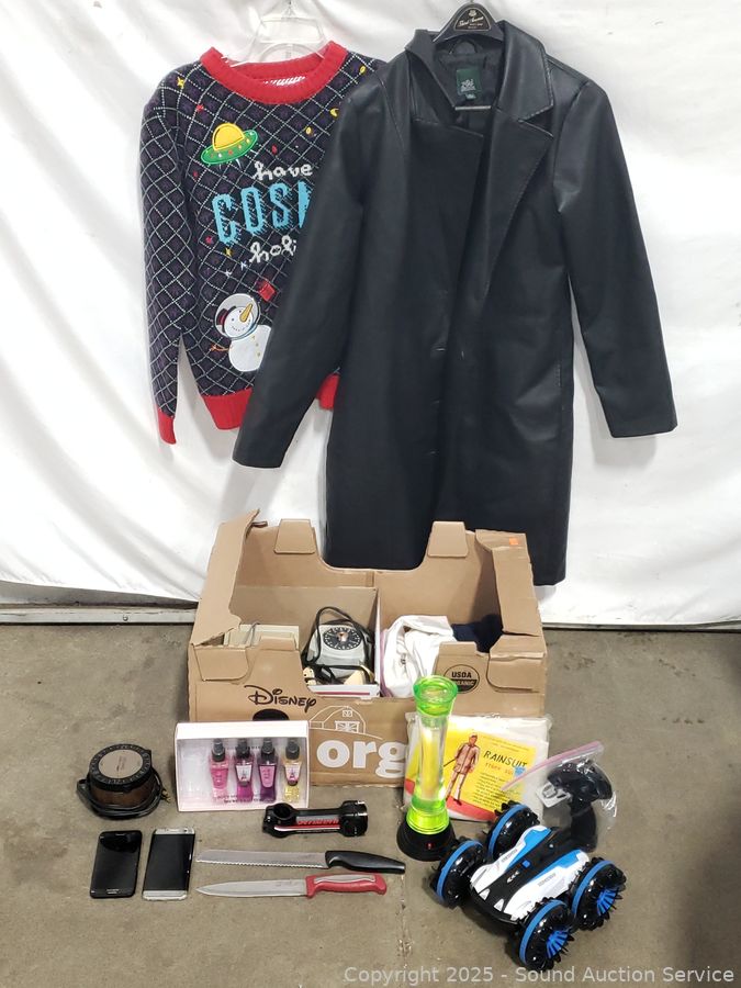 Child's comic Christmas sweater, Wild Fable black leather jacket, body mist spray, Samsung Galaxy S7 Edge smartphone (unknown condition), RC car (unknown condition), kitchen knives, etc. Refer to photos for lot contents, more details. As is.