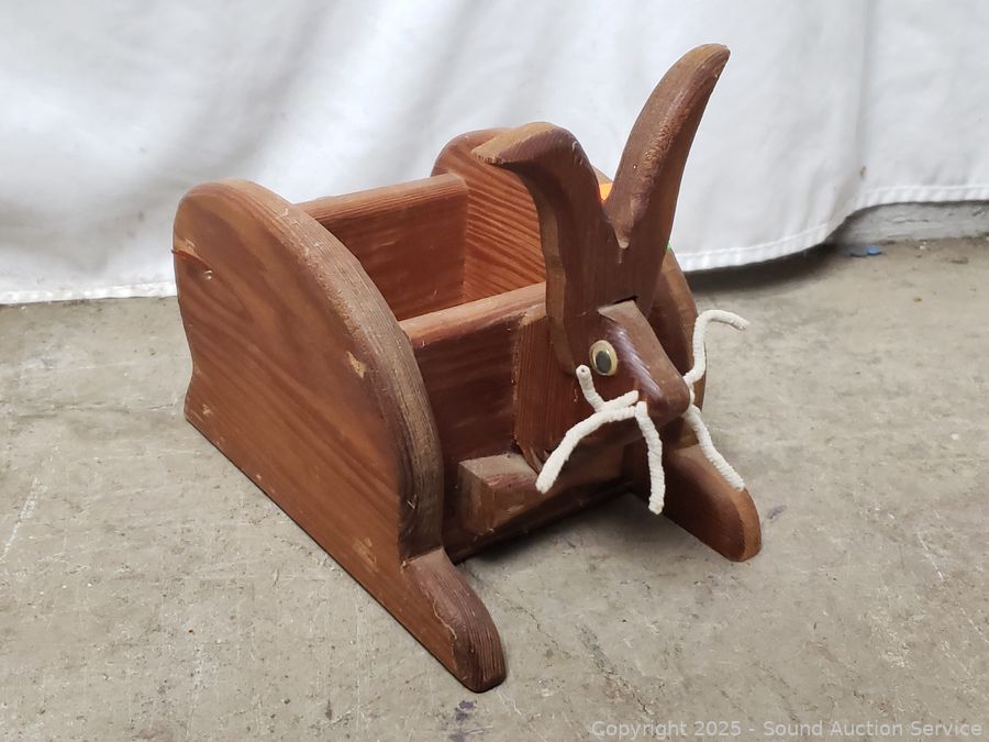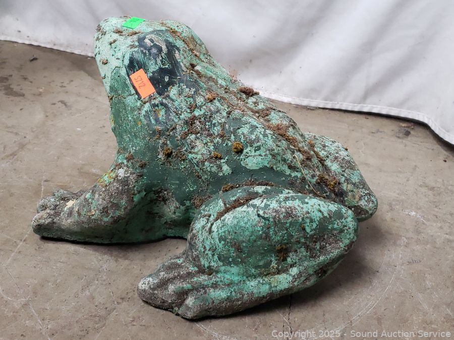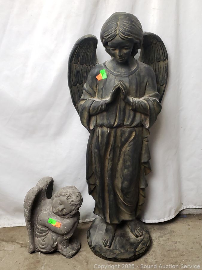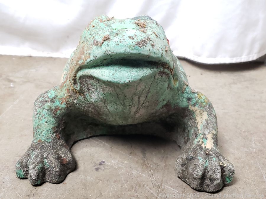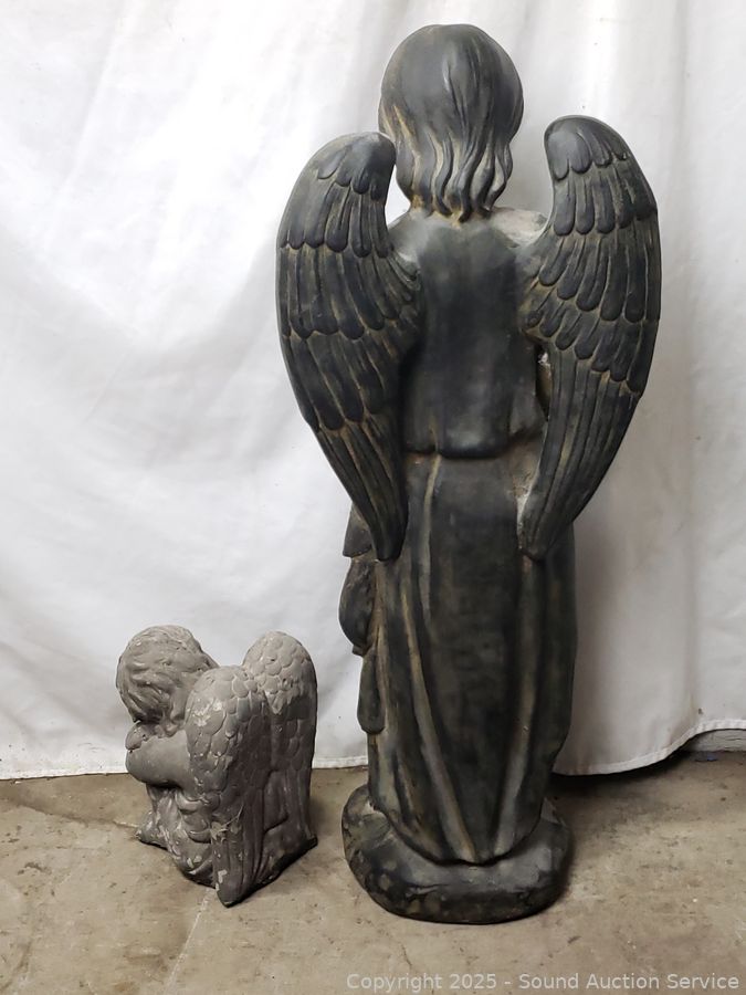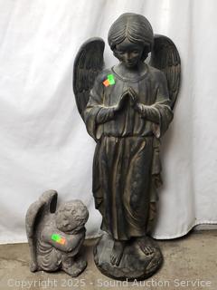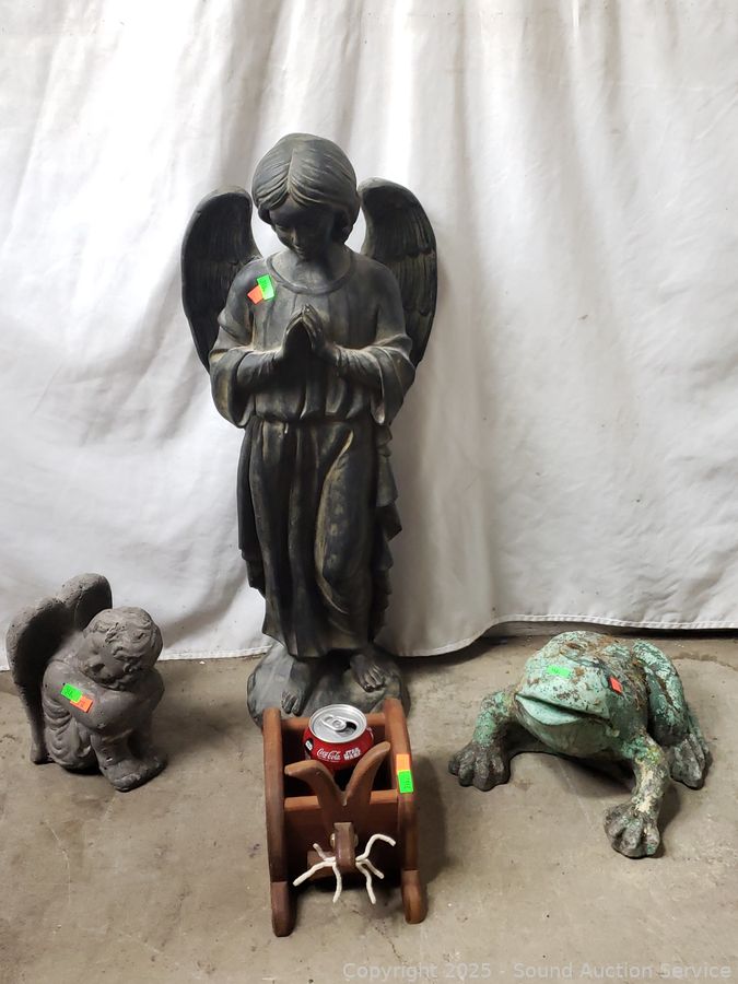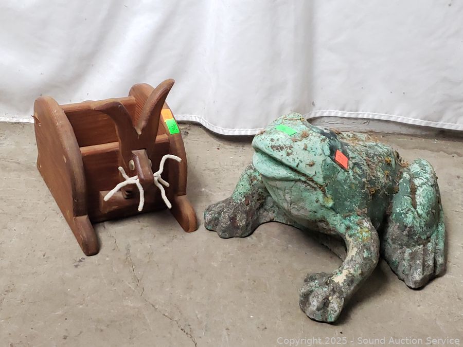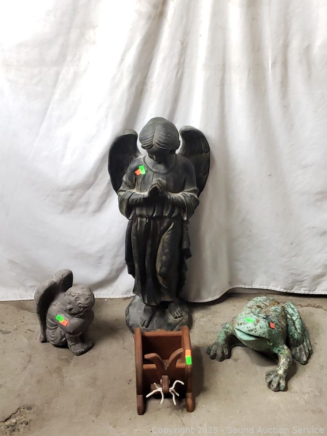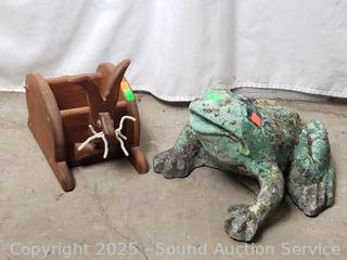 Lot #0346: Concrete Frog, Concrete & Composite Angel Figure, Wood Rabbit Box