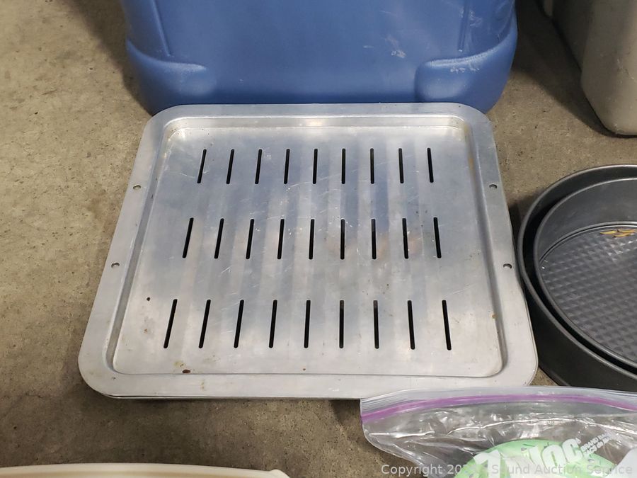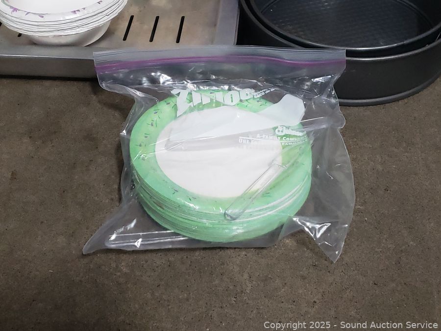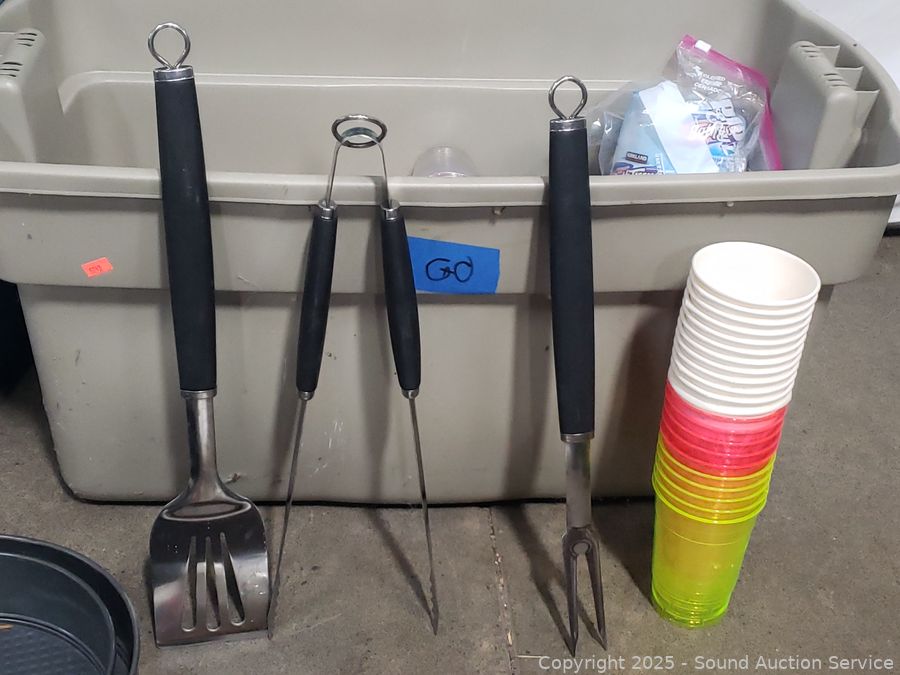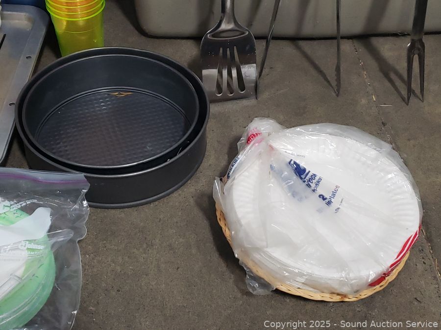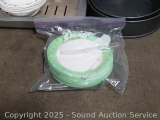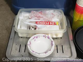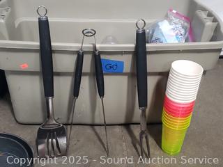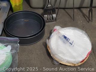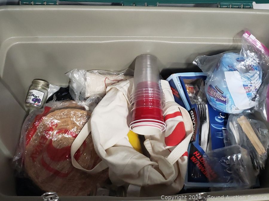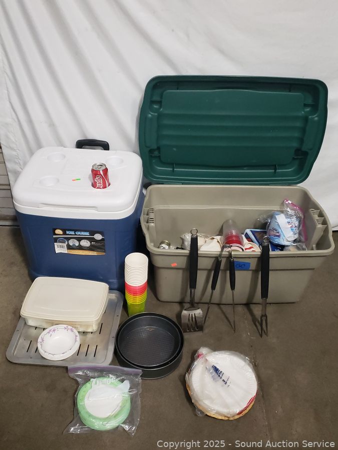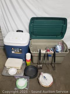 Baking pans, plastic cutlery, paper cups, plates, baking sheet. 16.5" H x 31" W x 19" D tote, 20" H x 19"' x 18" cooler.