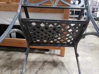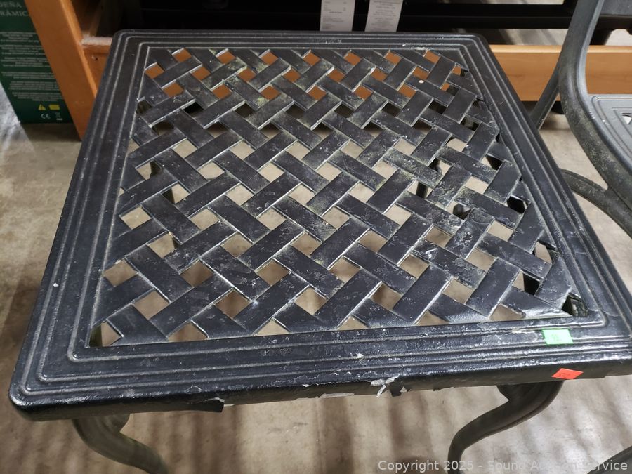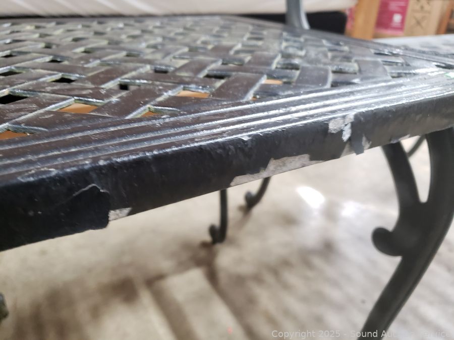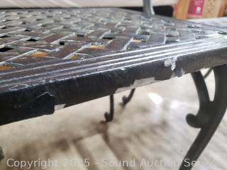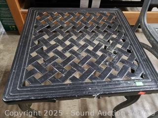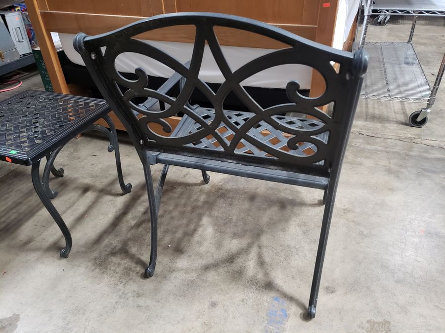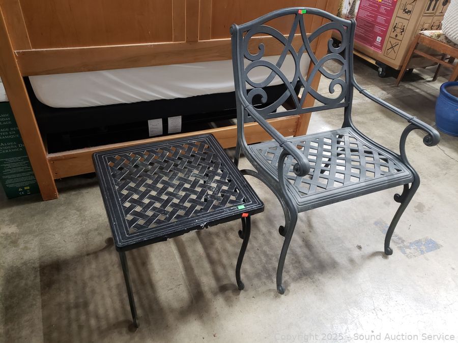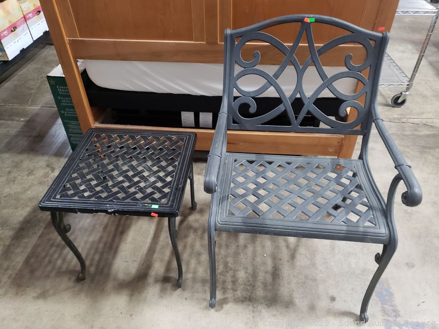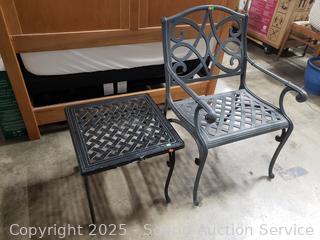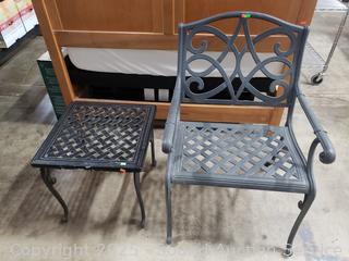Table has various wear, 18" H x 18" x 18". Chair has some scuffs, 35" H x 23" W x 17" to seat.