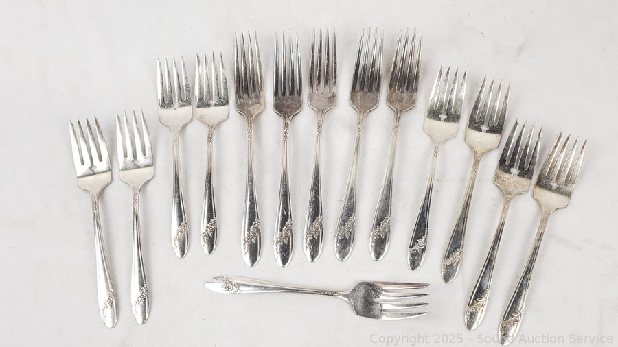 9 small forks, 5 large forks, 12 small spoons, 3 large spoons, 12 butter knives, 5 appetizer forks, cake knife, ladle, 2 spreaders.