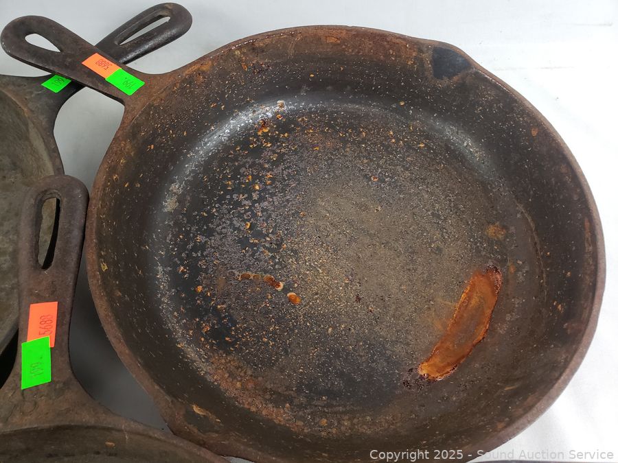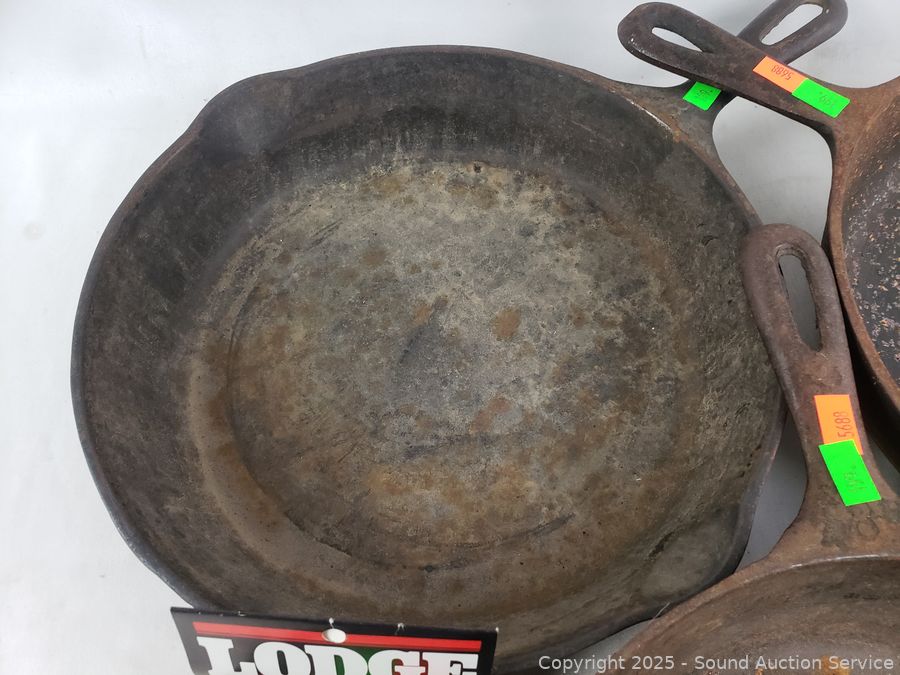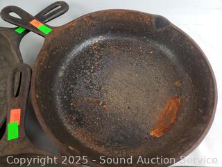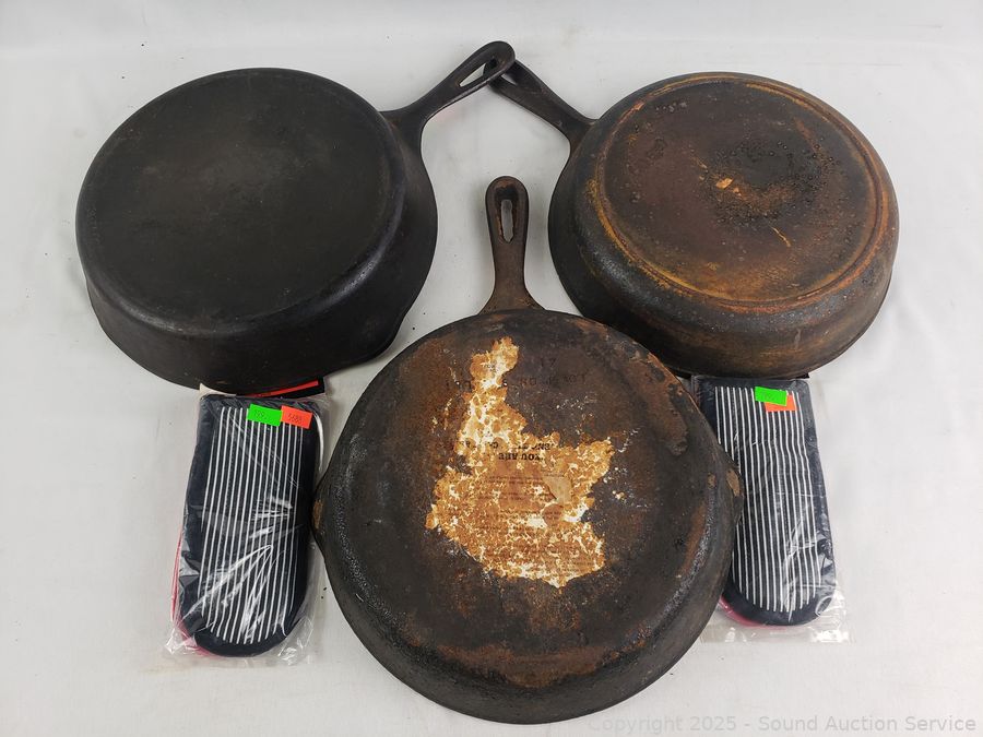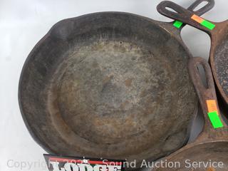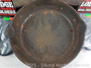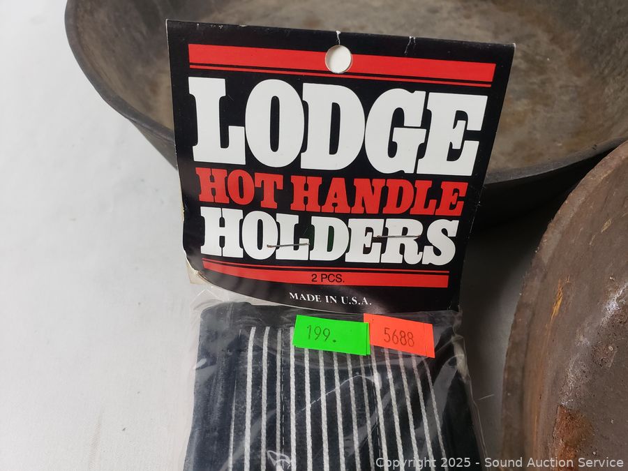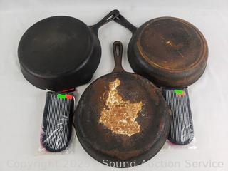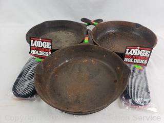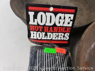Lot #0199: 3 Cast Iron 10" Skillets & (2) 2pk Lodge Hot Handle Holders