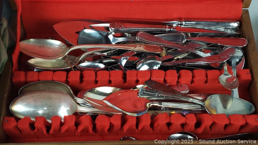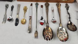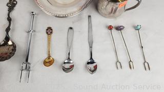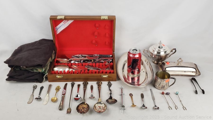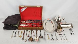 Lot #0207: Assorted Silverplate Utensils, Dishes, Cloths