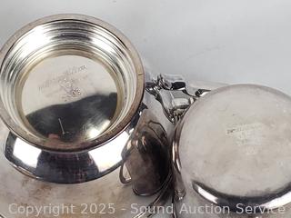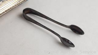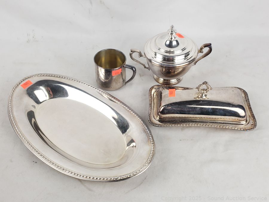 Sugar dish, oval platter, butter dish, cup, several silvercloths, various utensils. Refer to photos for lot contents, more details.
