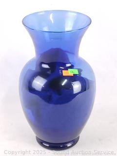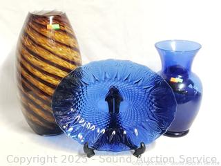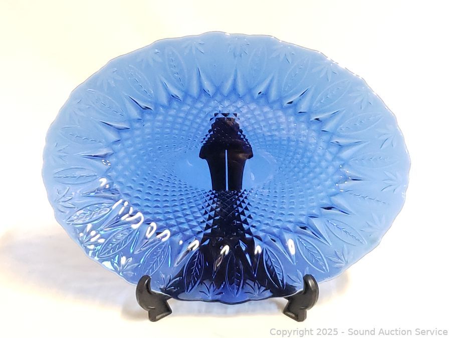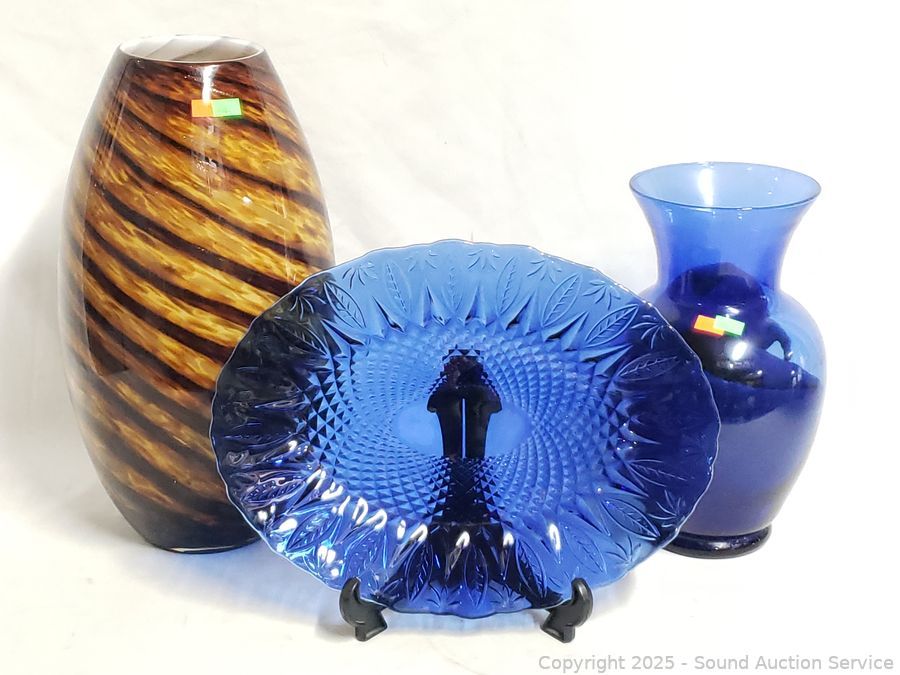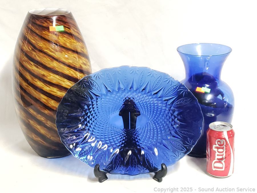 Avon Sapphire Platter, Case & Cobalt Glass Vases - 11" to 15" H x 6" to 8" Dia. vases. 14" platter. Don't see any issues.