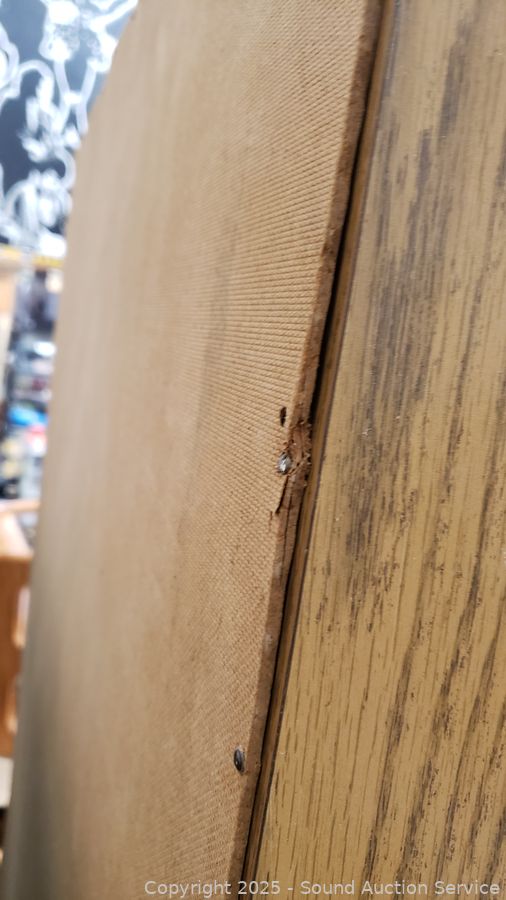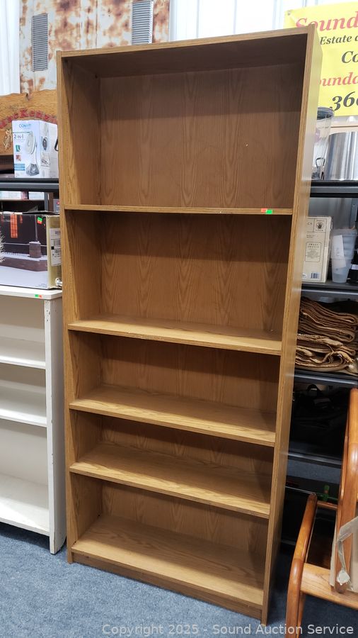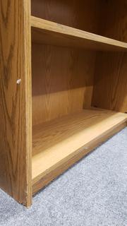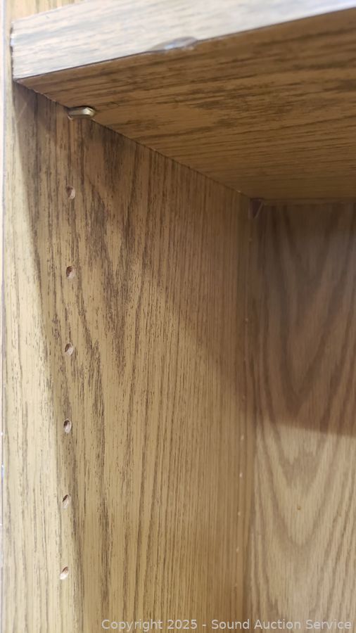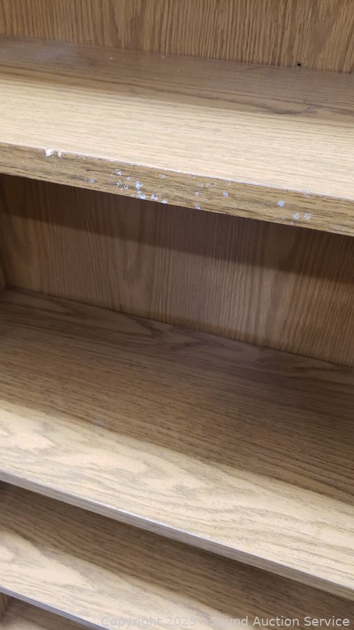 Particleboard construction, oak veneer finish. 3 shelves are adjustable, 1 is fixed. 84.5" H x 36" W x 12" D. Some minor chips, wear to finish, starting to peel at the bottoms.