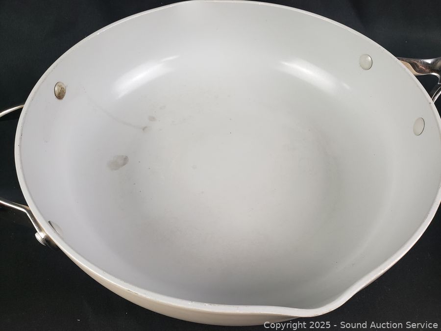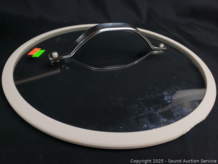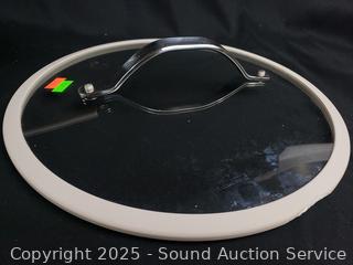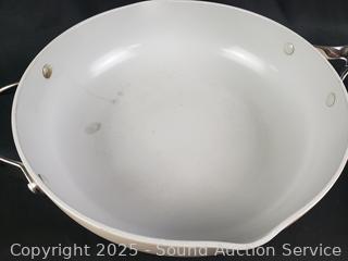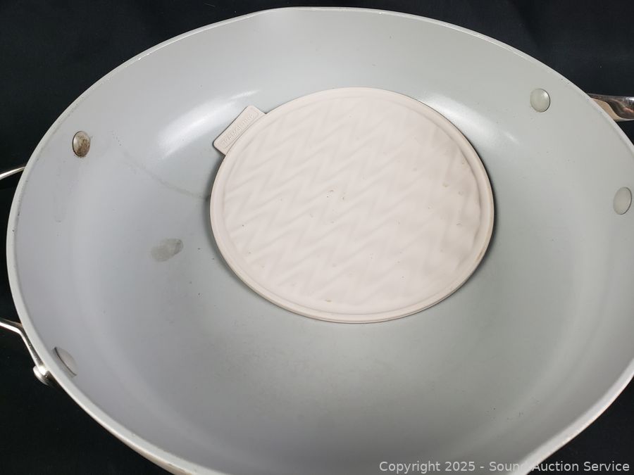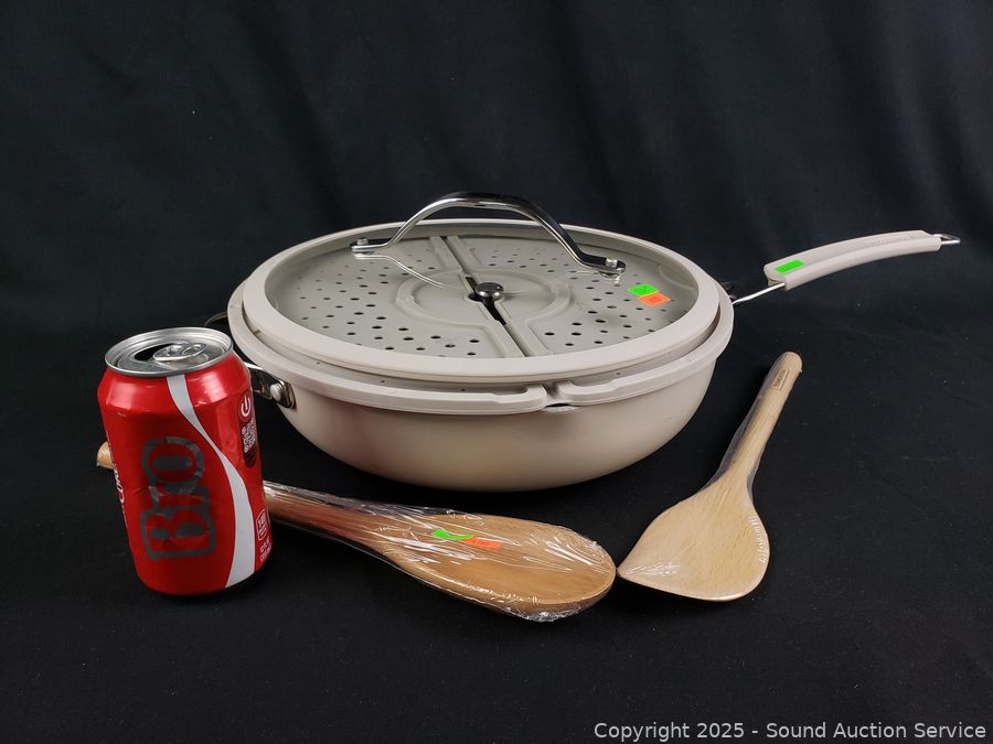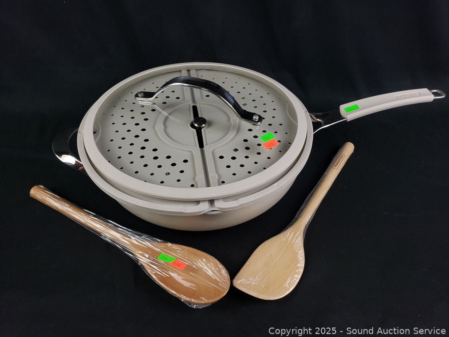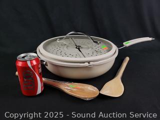 Comes with 2 wood utensils, silicone trivet, splatter screen, steamer insert & lid. Some light wear from use, lid has damage on edge.