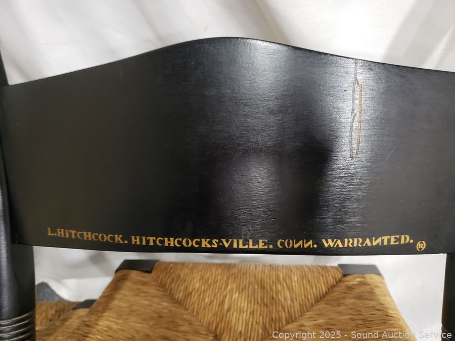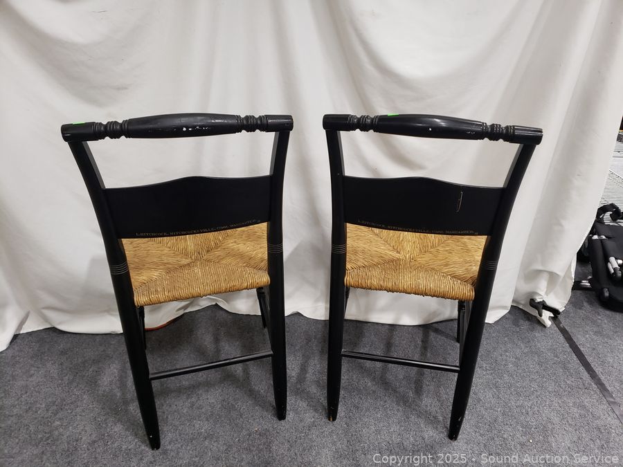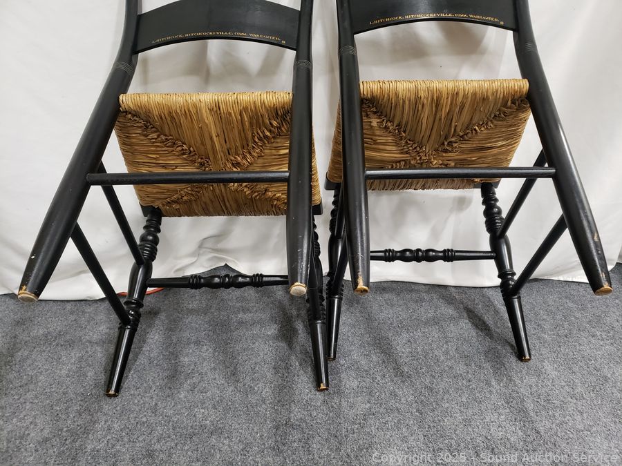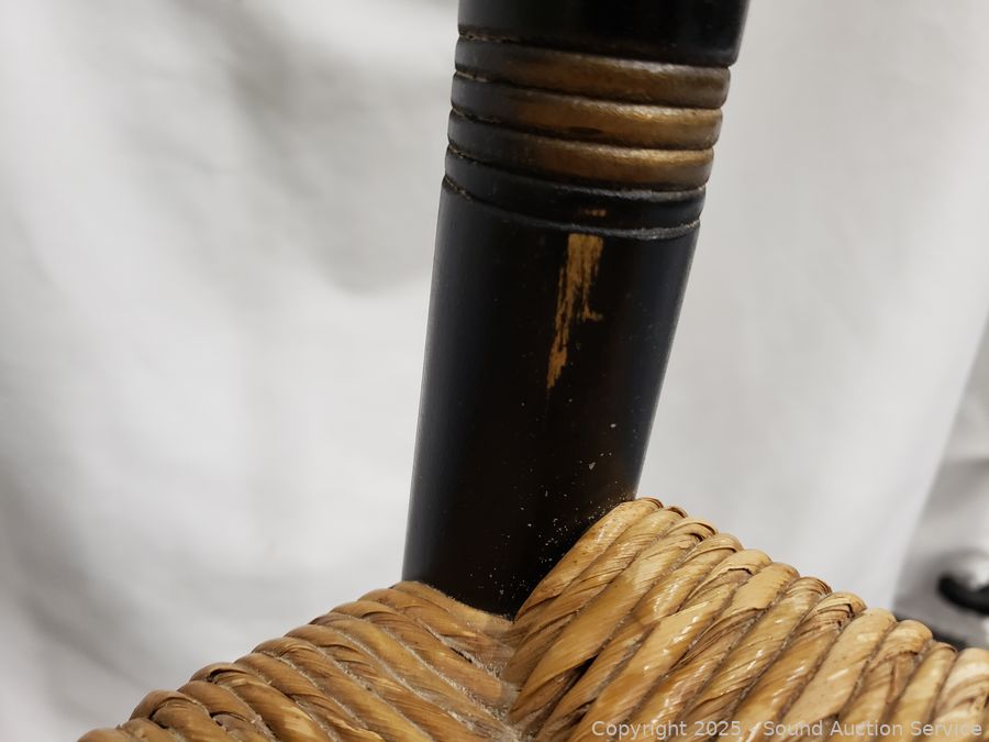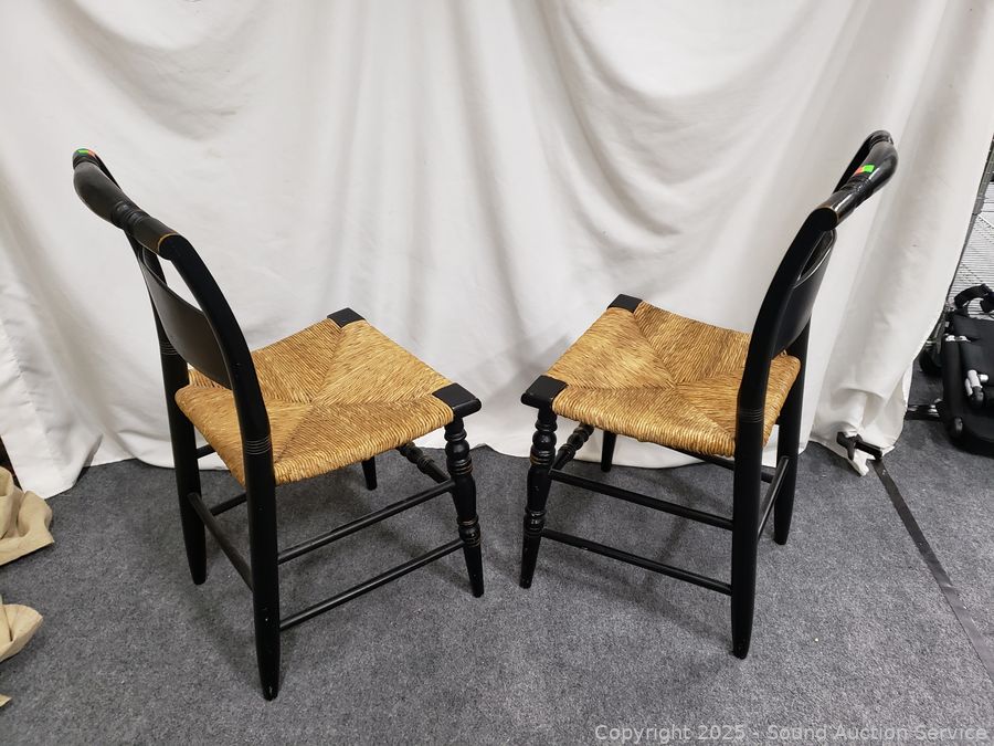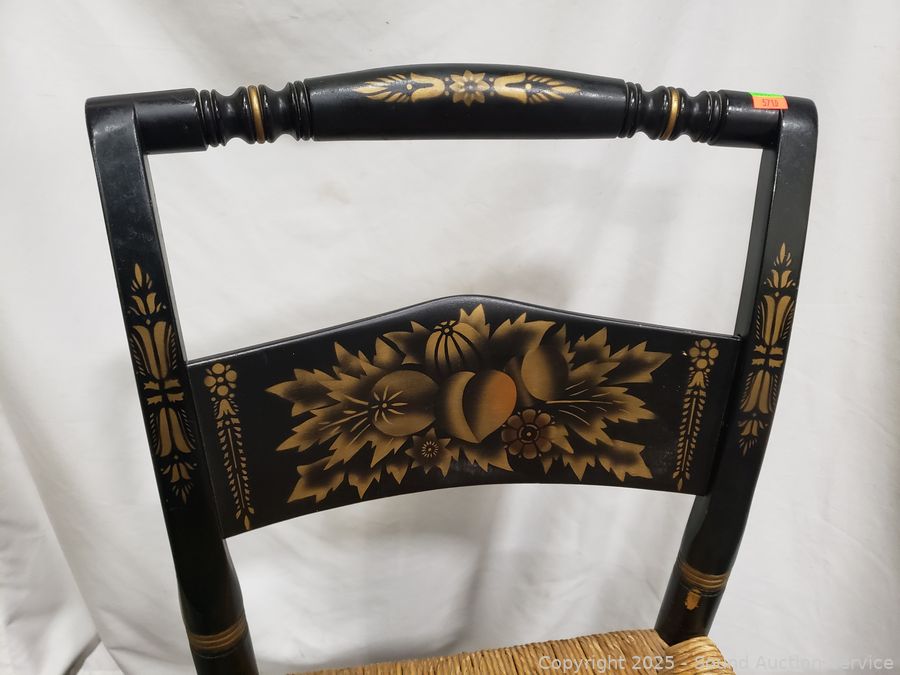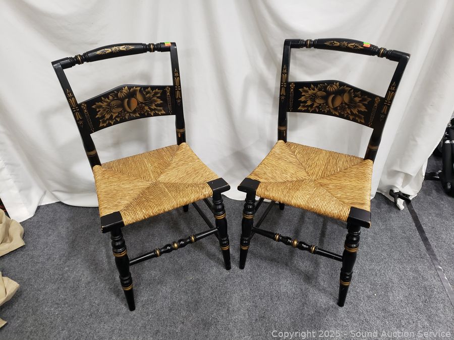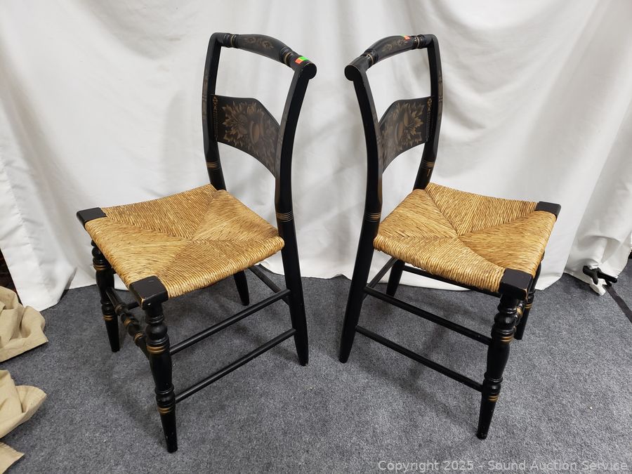 Lot #0101: 2 Lambert Hitchcock Ebony Gold Printed Turn Wood Rush Seat Accent Chairs