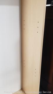 67.25" H x 23.25" W x 9.75" D. 3 shelves are adjustable, no shelf pegs, one is fixed. particleboard construction, simulated wood grain finish.