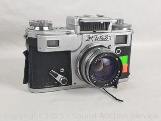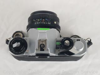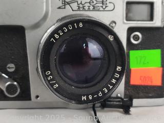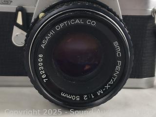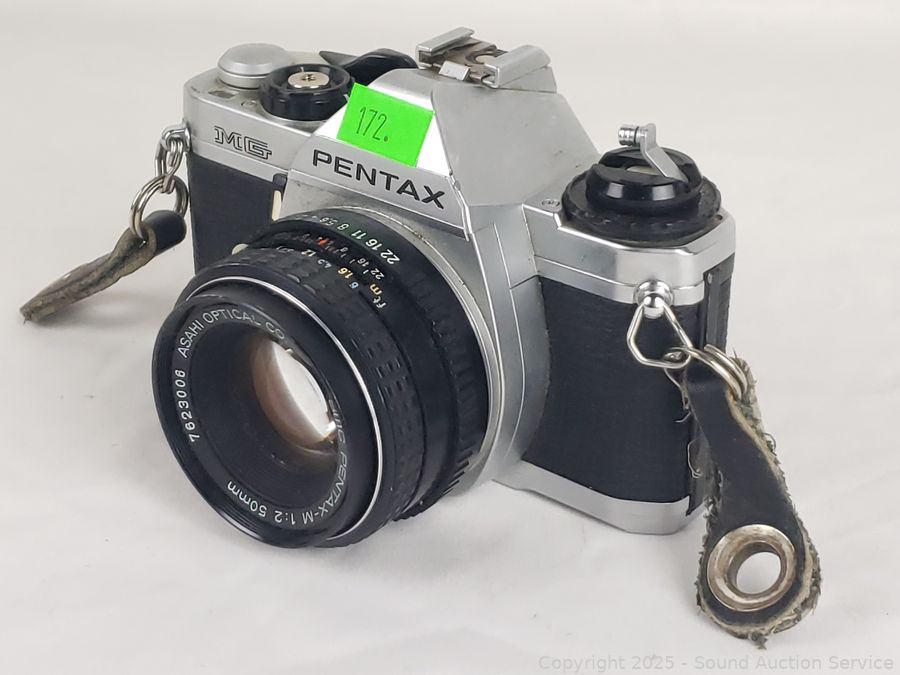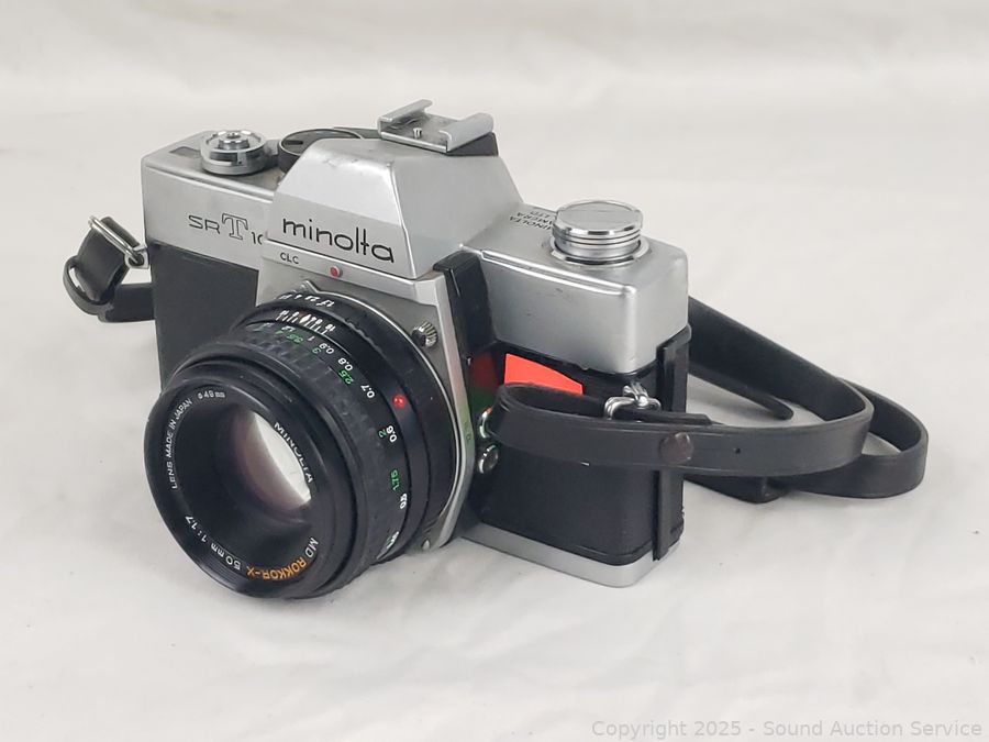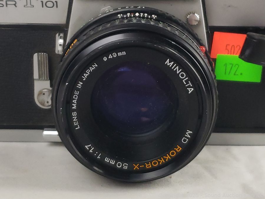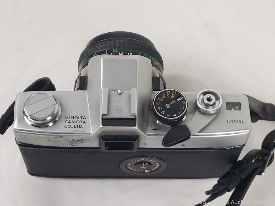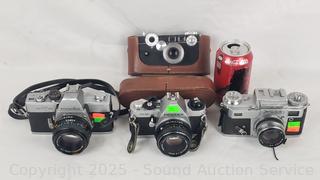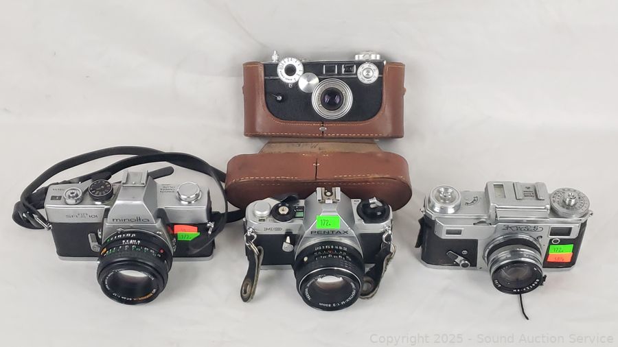 Russian camera (couldn't get shutter to work), Pentax MG w/50mm 1:2 lens (don't hear/feel of shutter is working), Minolta SRT101 w/50mm 1:1.7 lens (shutter works), Argus 50mm camera (shutter works).