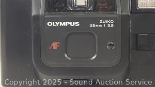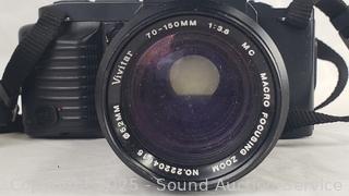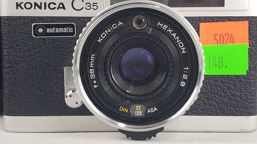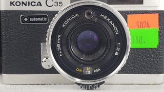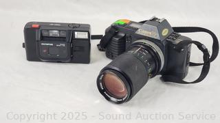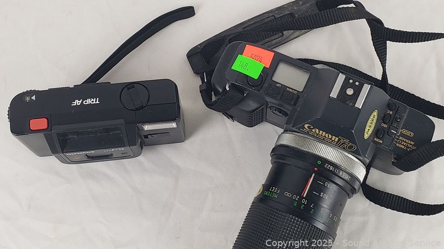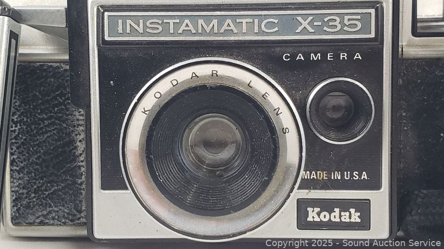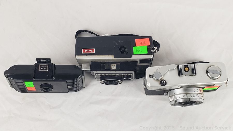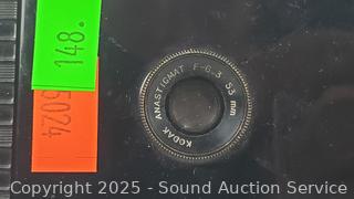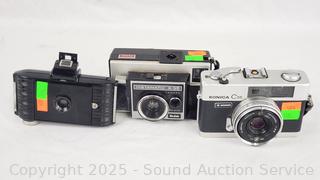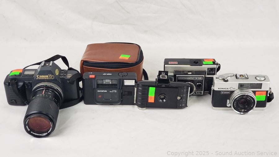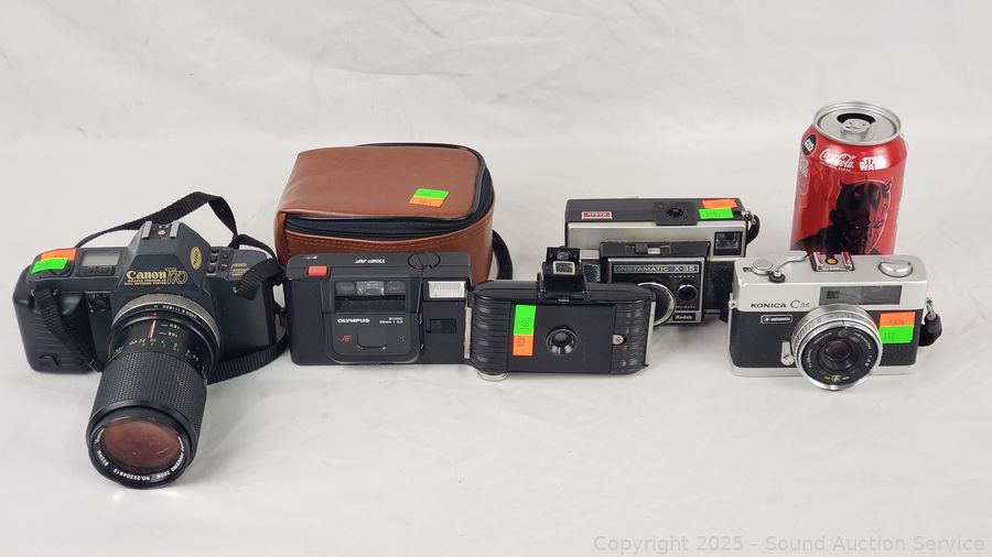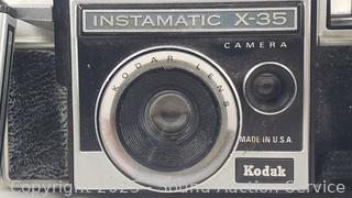 Kodak Anastigmat (shutter works), Olympus 35mm (untested), Canon T70 w/Vivitar 70-150mm Lens (untested), Kodak Instamatic X-35 (shutter works), Konica C35 (shutter works). Signs of wear from use.