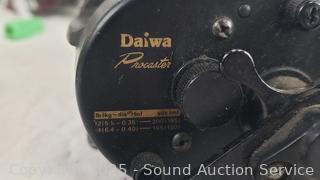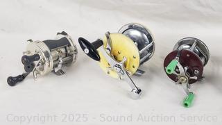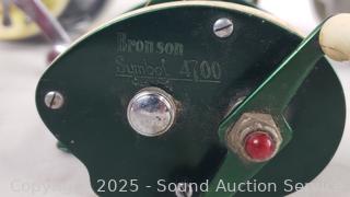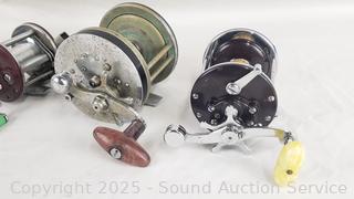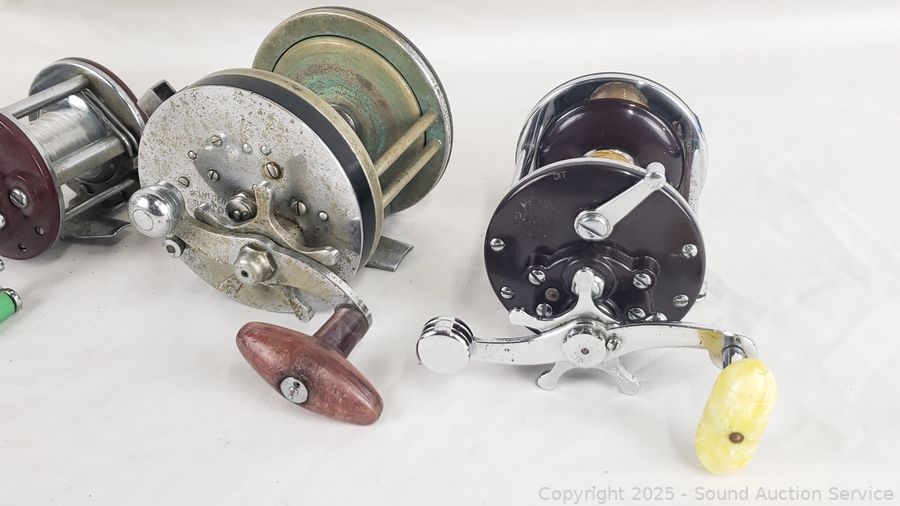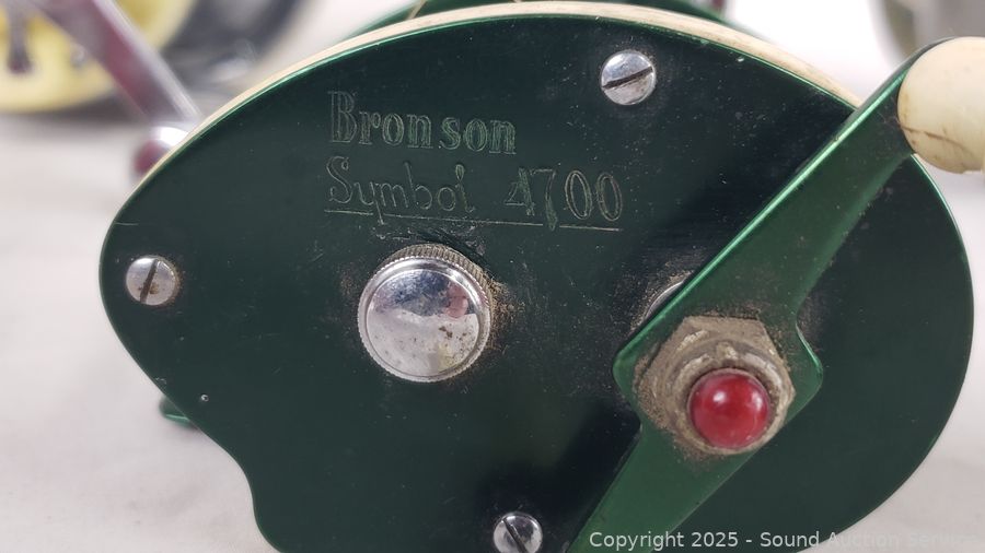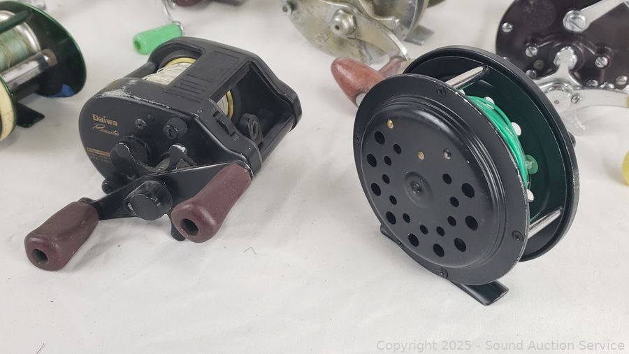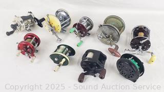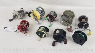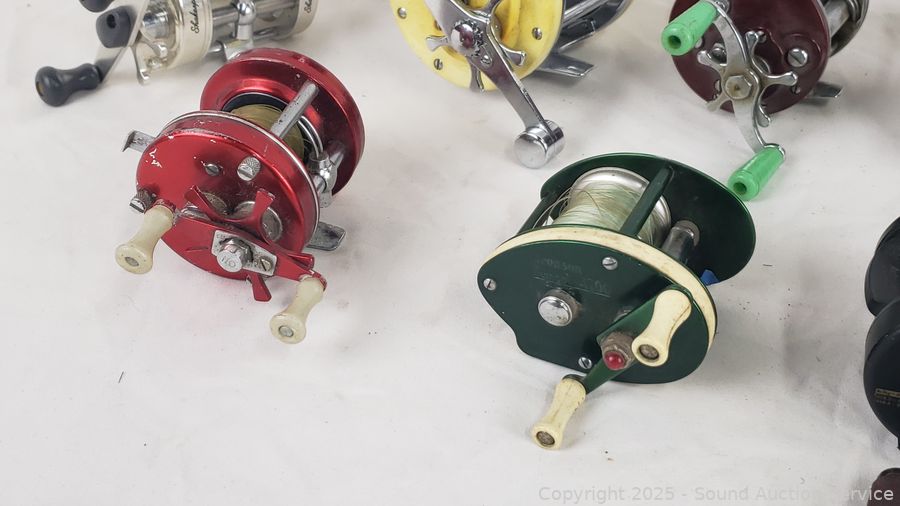 Penn No.25, Garcia Mitchel No.304, Pflueger Capitol No.1989, Shakespeare No.1094, Abu Ambassadeur 5000, Penn Peer No.109, Shakespeare SKP2000S, Procaster PM35SH, Bronson Symboi 4700 reels. Signs of wear from use.