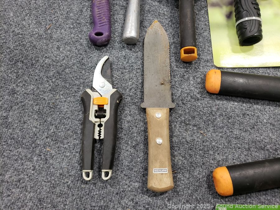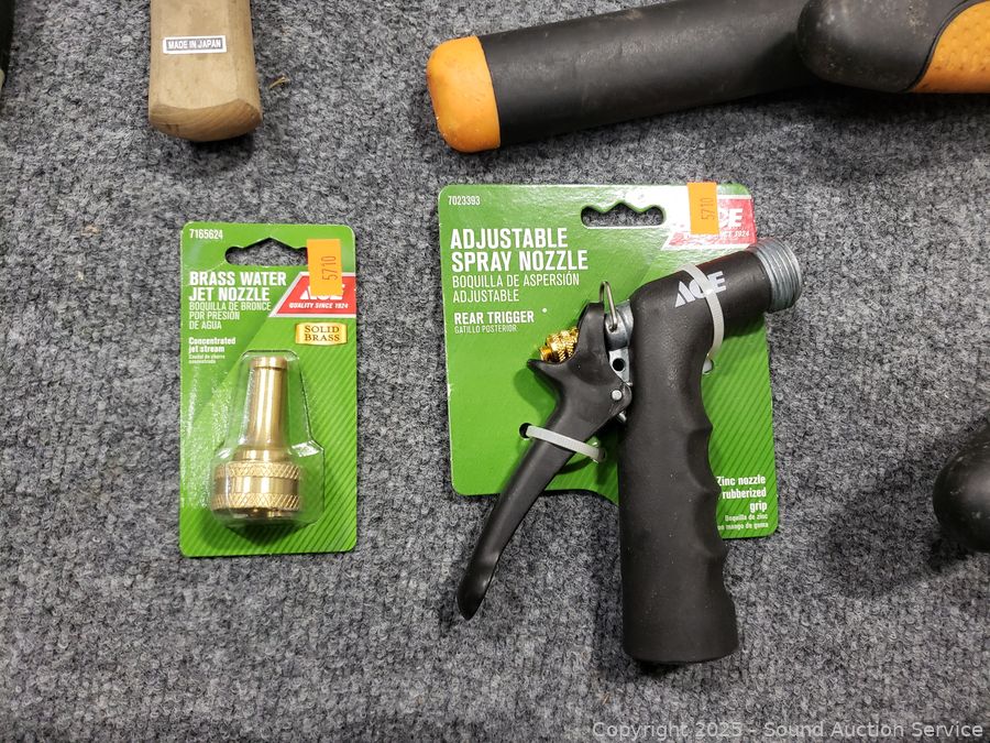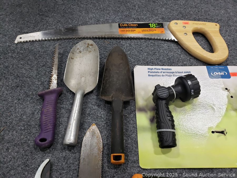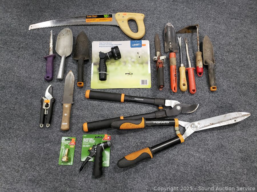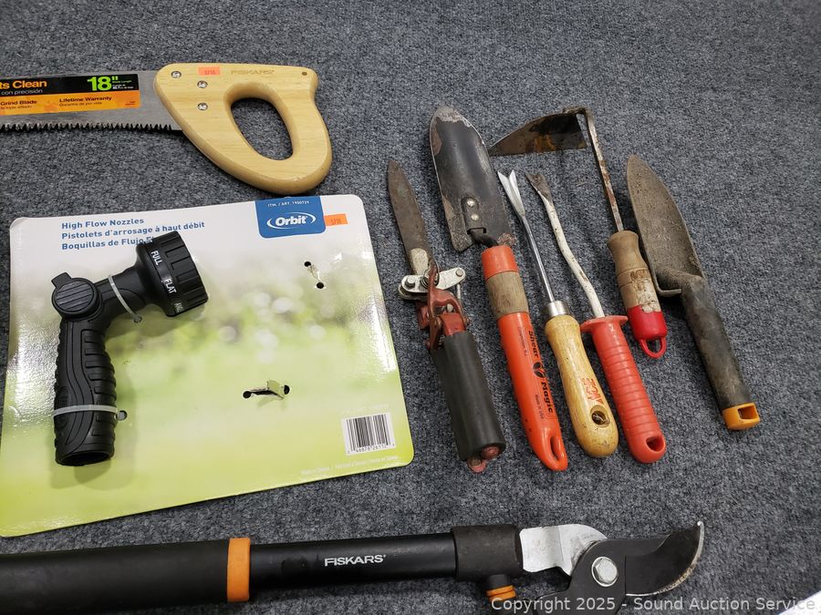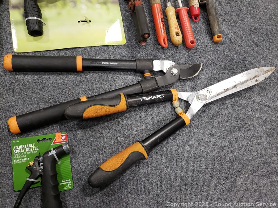 Nozzle, loppers, handsaw, trimmers, garden shovel, pruners, etc. Refer to photos for lot contents, more details.