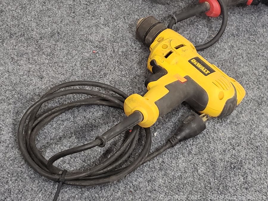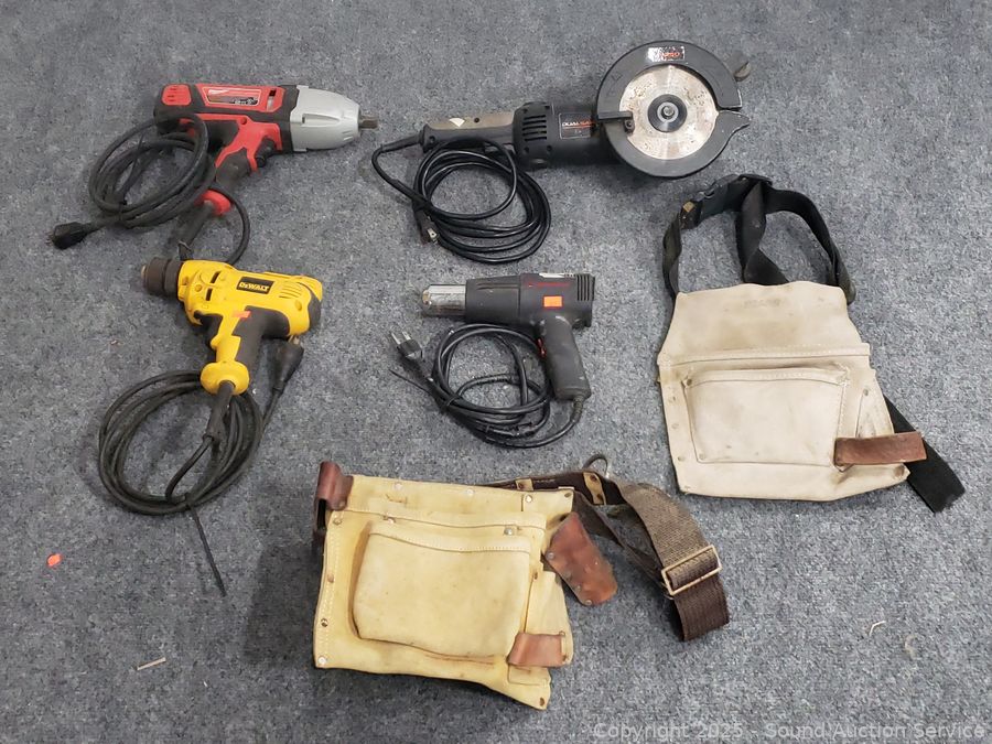 DeWalt 1/2" Drill DWD115, Right Angle Dual Saw, Milwaukee 1/2" Drive Impact Wrench, Heat Gun. All work. Signs of use.