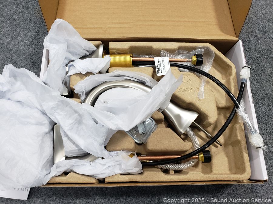 Comes with clicker drain, brushed nickel finish. Appears complete, never installed.