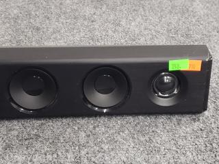 Has power, tested bluetooth, works. One speaker has cosmetic damage. 3" H x 37.5" W x 2".