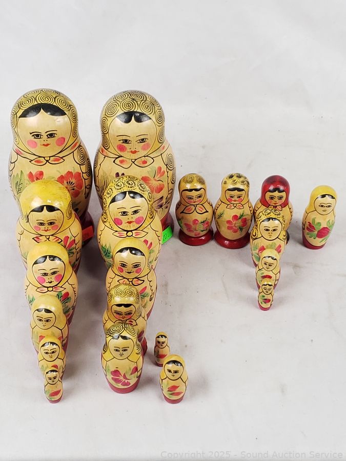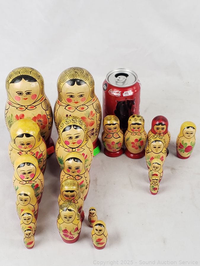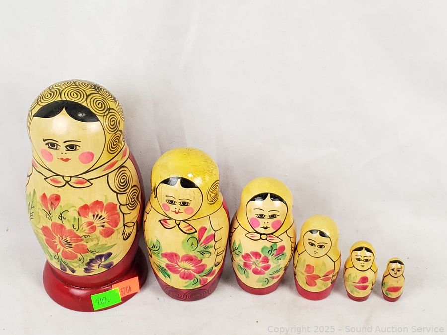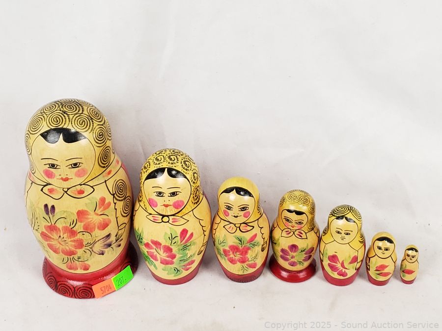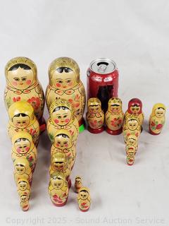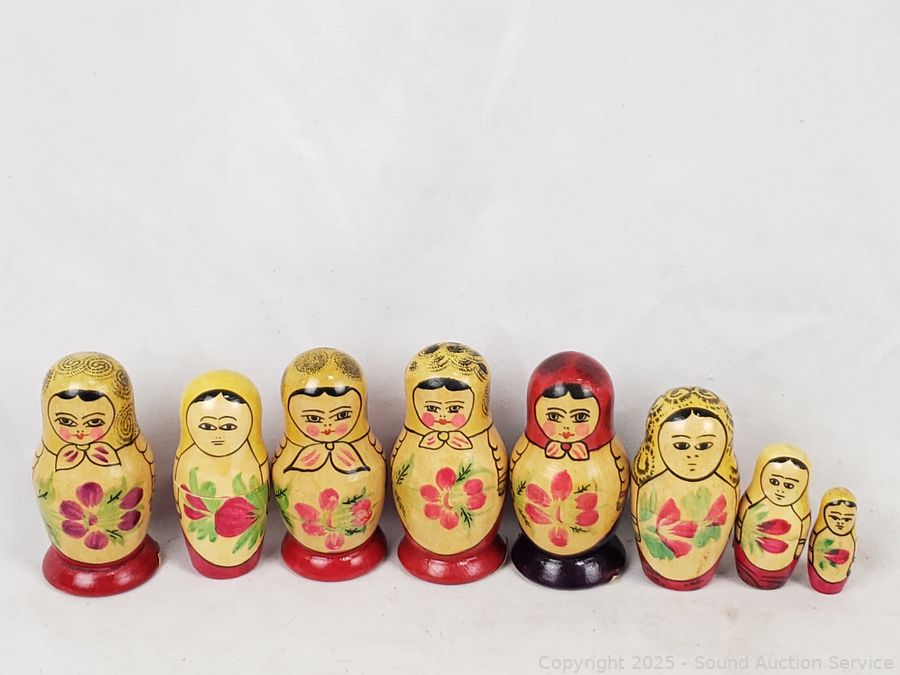 Lot #0207: 3 Wood Russian Nesting Dolls & 5 Individual Wood Dolls