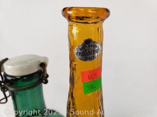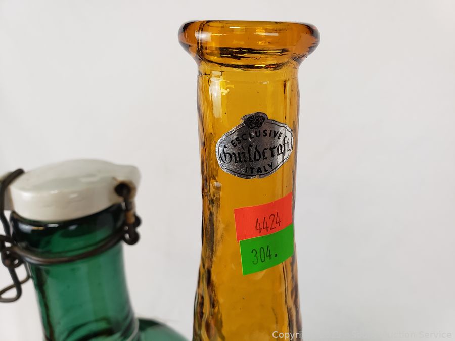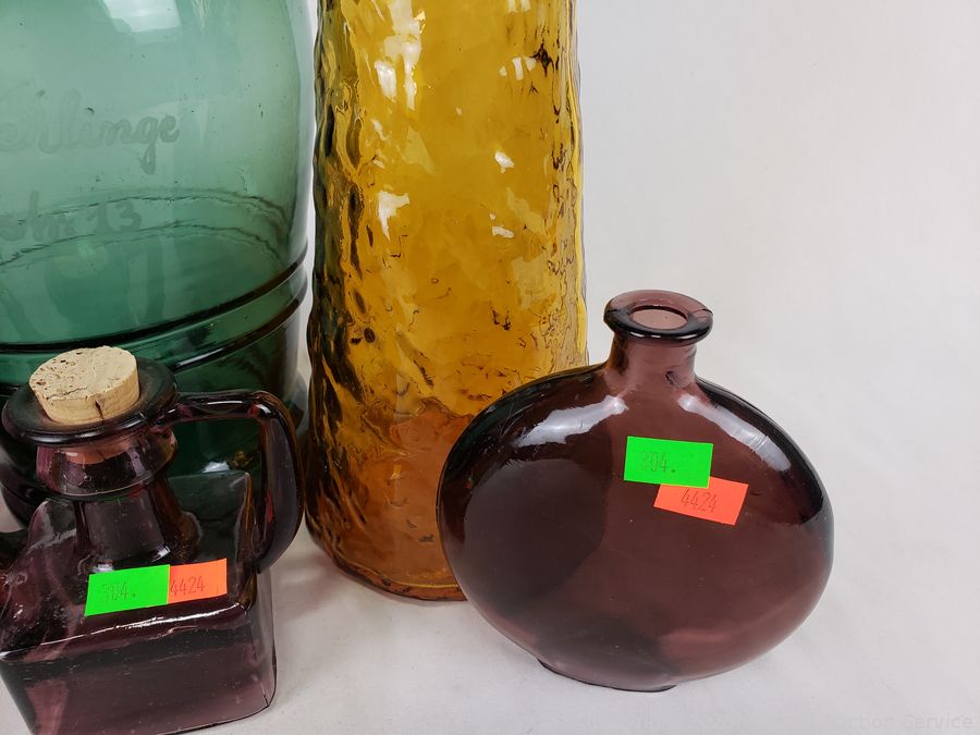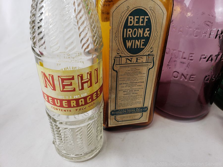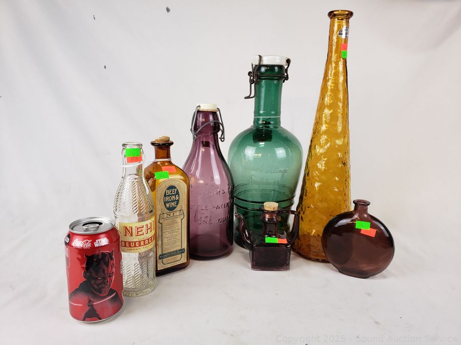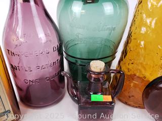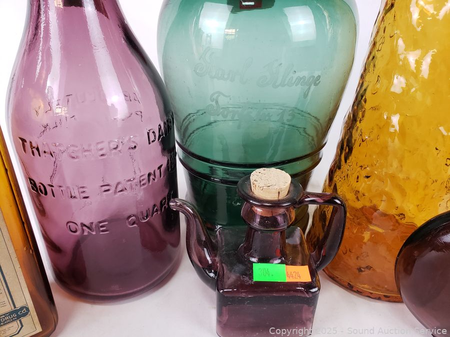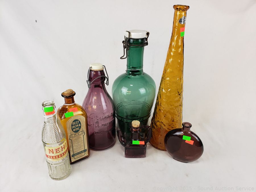 2L Dark Green Glass Etched "Karl Klinge Torfster 13" bottle, Beef Iron & Wine bottle, Nehi bottle, Absolutely Pure Milk purple bottle, Guildcraft Italy marigold bottle, Purple flask, Purple cruet. Refer to photos for more details.