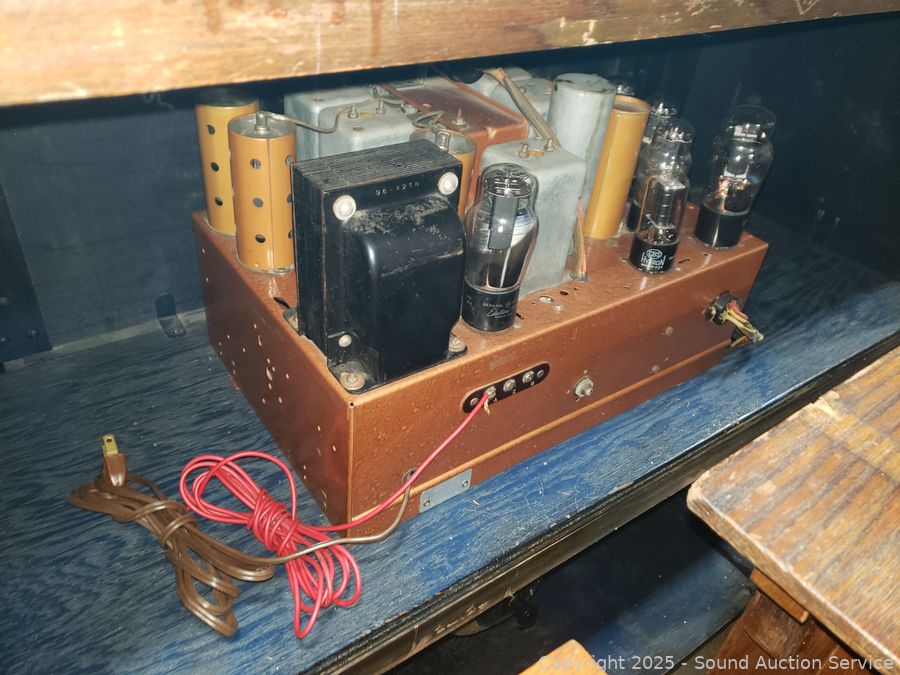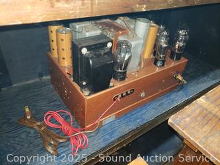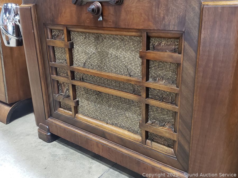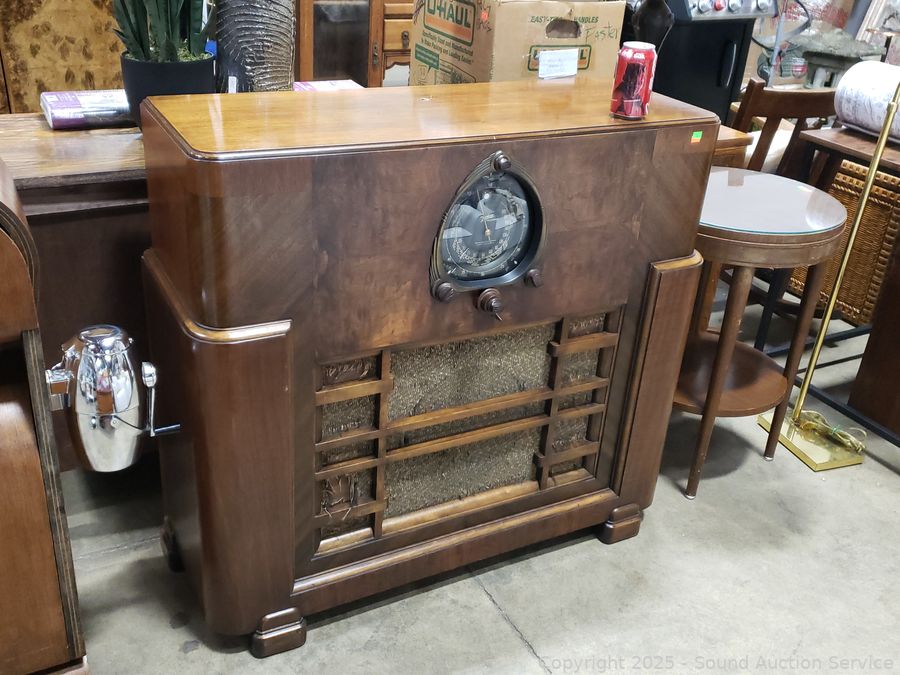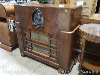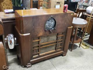 Has power, couldn't pickup a signal in the warehouse. Knobs are all functioning, auto dial is working, light working. Some wear/damage to cloth grill, some scuffs, scratches. 36.5" H x 39.5" W x 14.5" D.