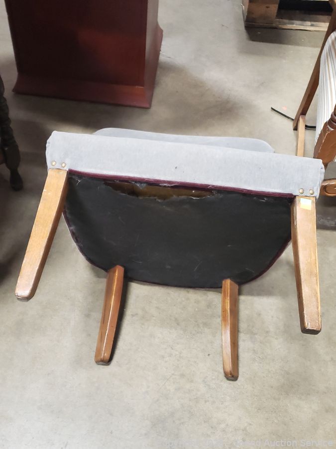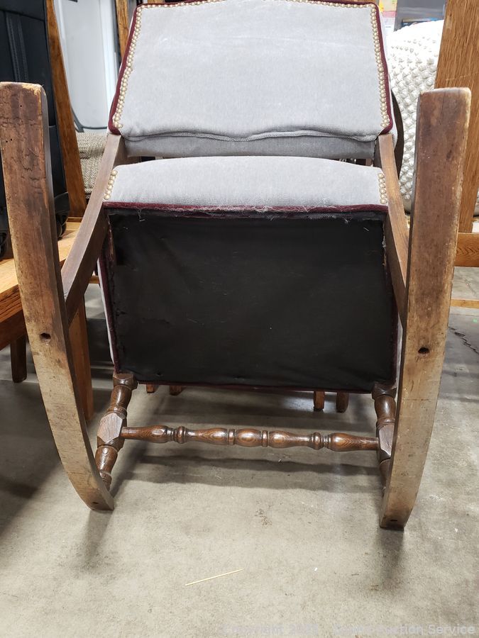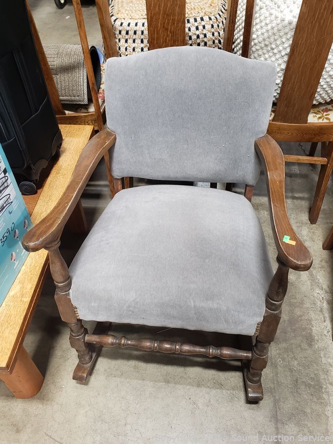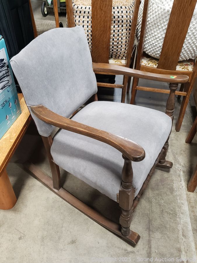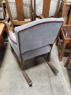 Gray Upholstered Wood Rocking Chair - 31.5" H x 24" W x 17" to seat.