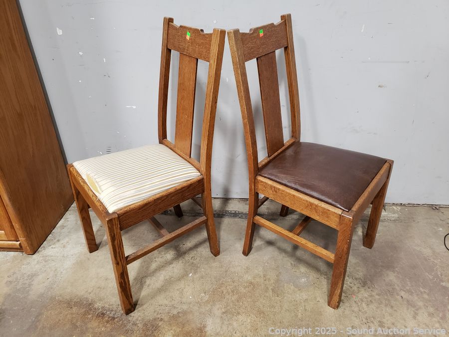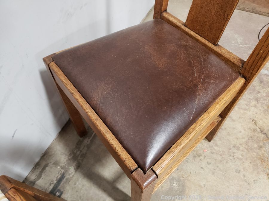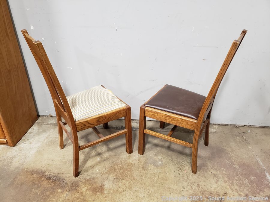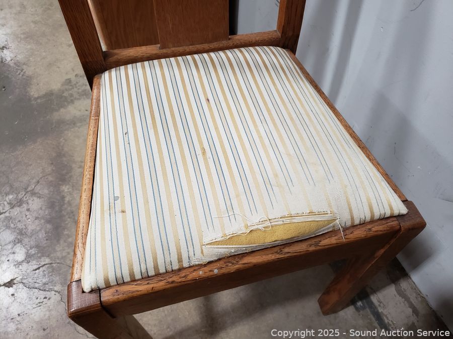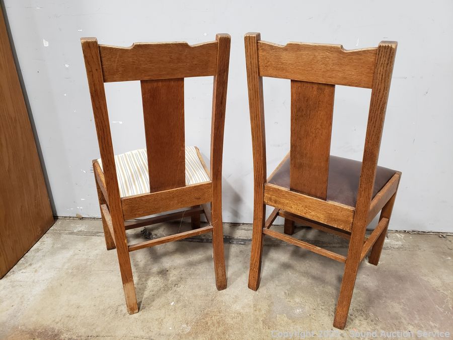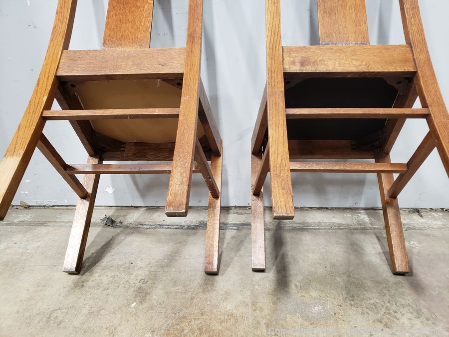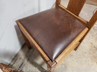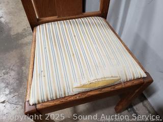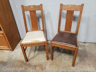 Pair of Oak Splat Back Chairs - Chairs match but have different upholstery, stripped one has damaged upholstery. 37" H x 17.5" W x 18" to seat.