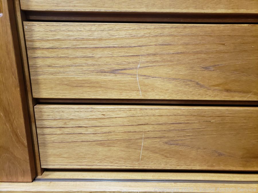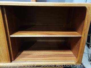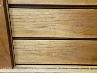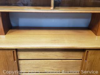 Glass doors in the top, wood fronts, teak veneer. dovetail joinery. See some rings from cups, etc. in the top. Hole in finish on the left side, some scratches on the front, top. 62" H x 79" W x 19.75" D.