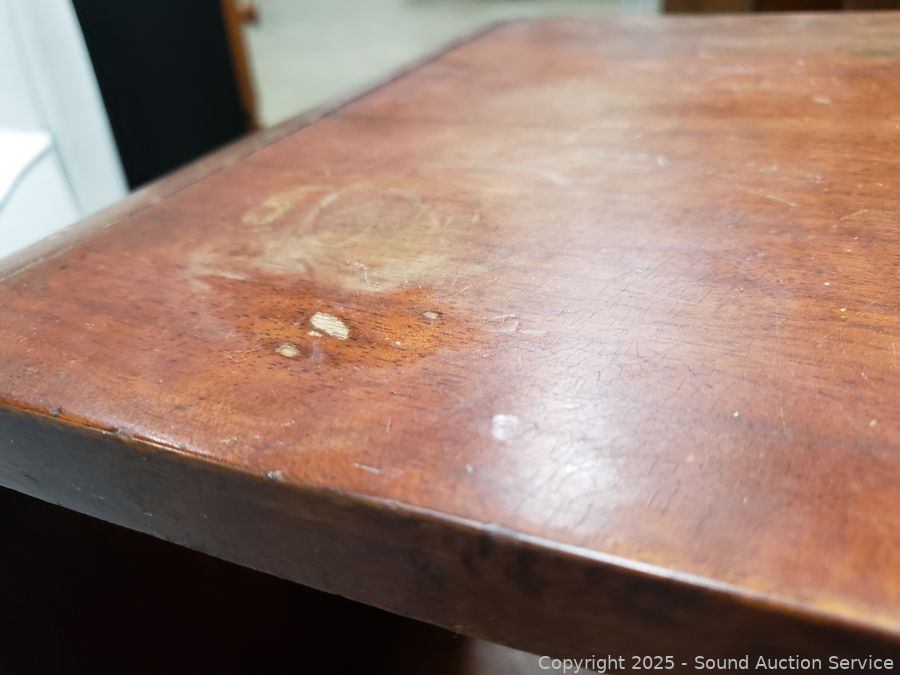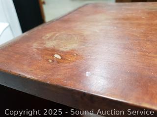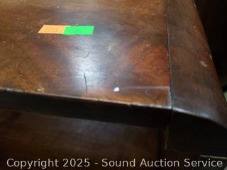 Solid wood construction. 20" H x 25" W x 11.75" D. Some scuffs, wear to finish.