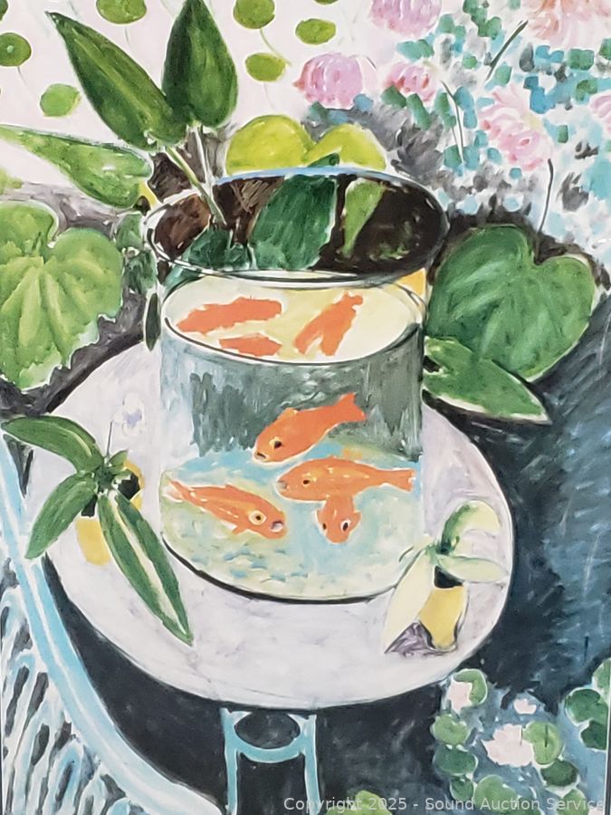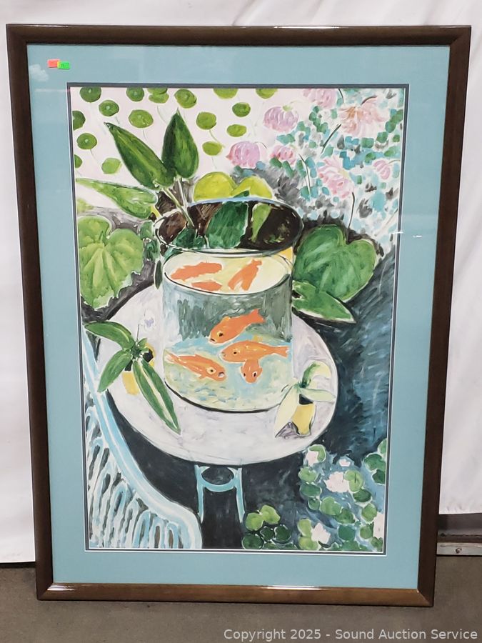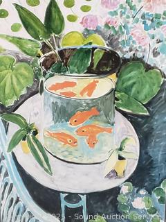 "Goldfish" by Henry Matisse, framed, matted with glass. 43.5" x 30.75". "They Shoot Painters" 37.5" x 25.5". Refer to photos for more details.