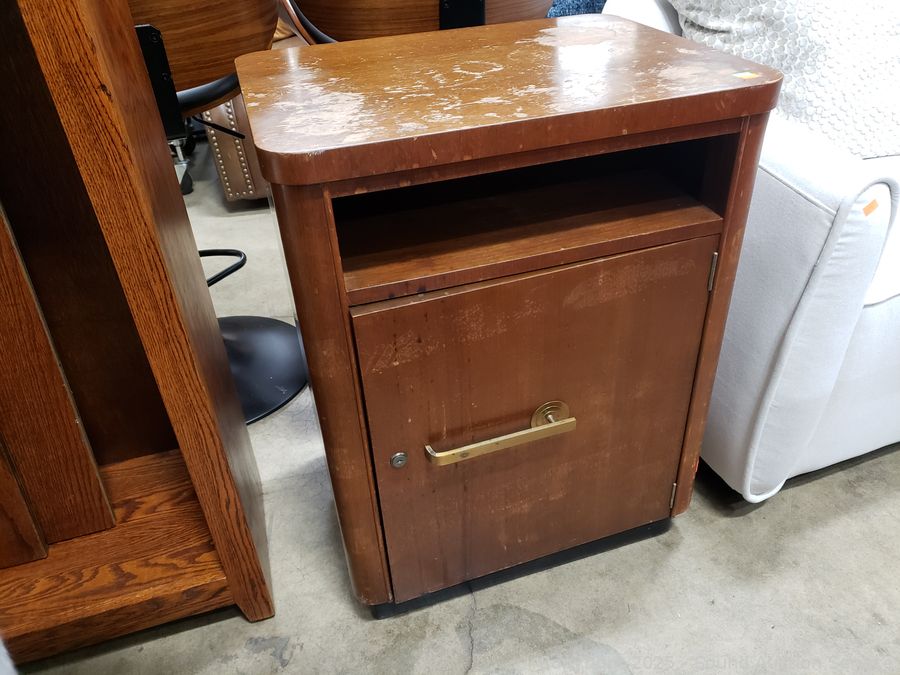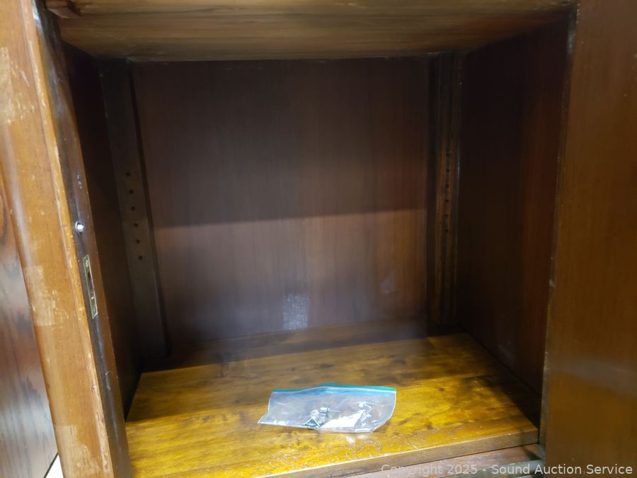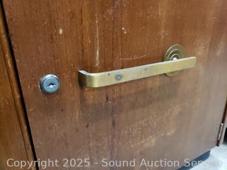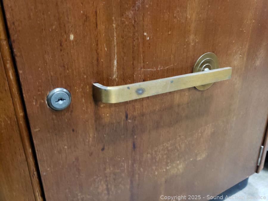 Locking, no key. Various scuffs, wear to finish. 29" H x 22" W x 17" D. Missing one shelf peg for shelf in cabinet.