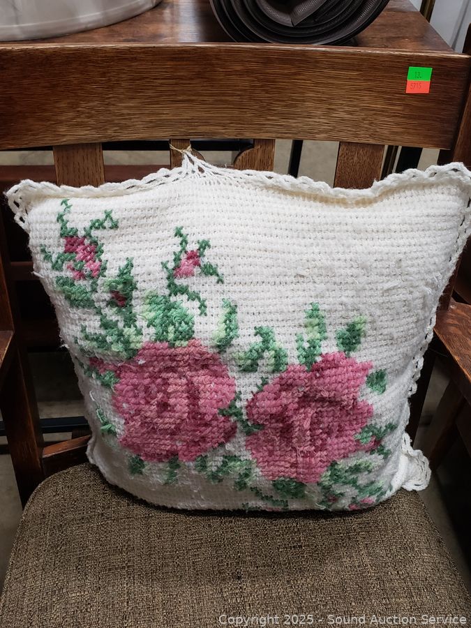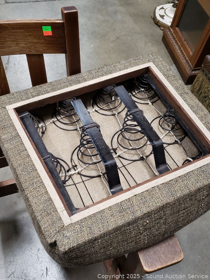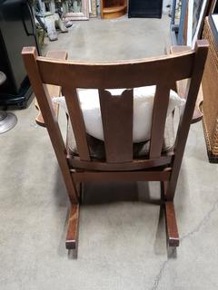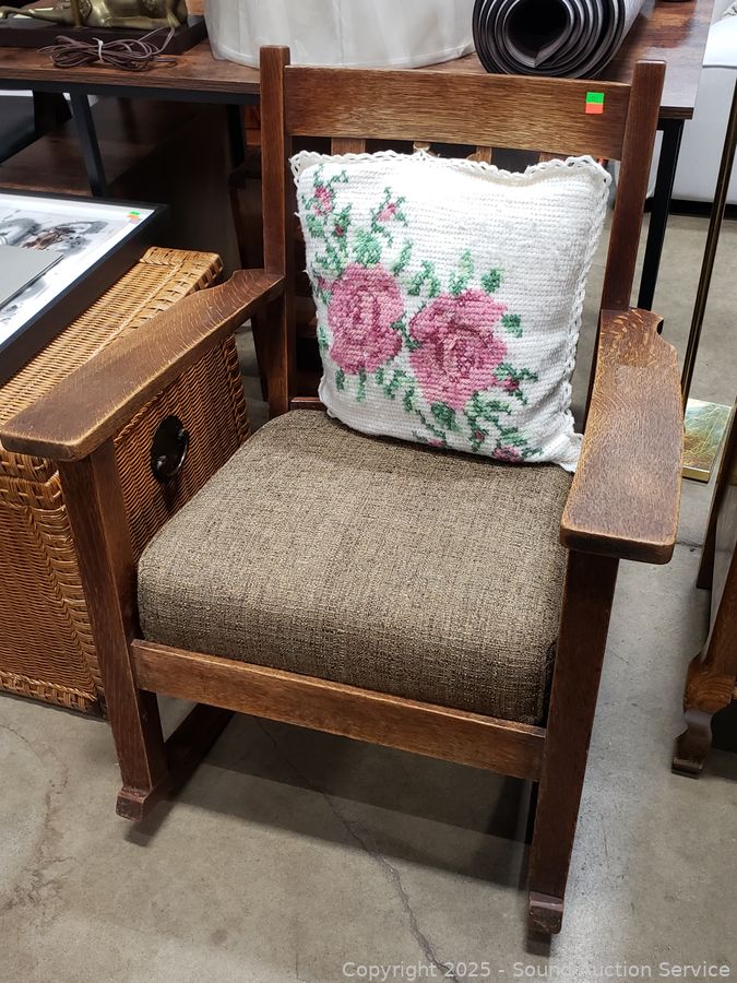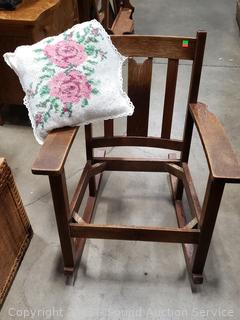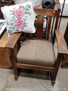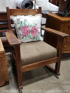 Lot #0013: Vintage Oak Upholstered Rocking Chair w/Knitted Pillow
