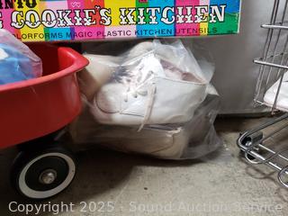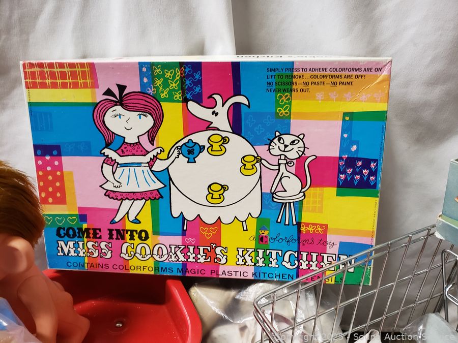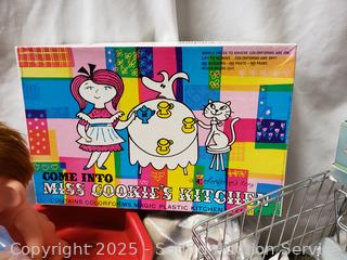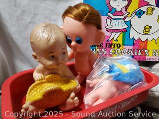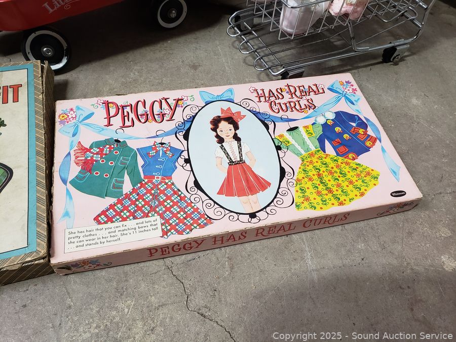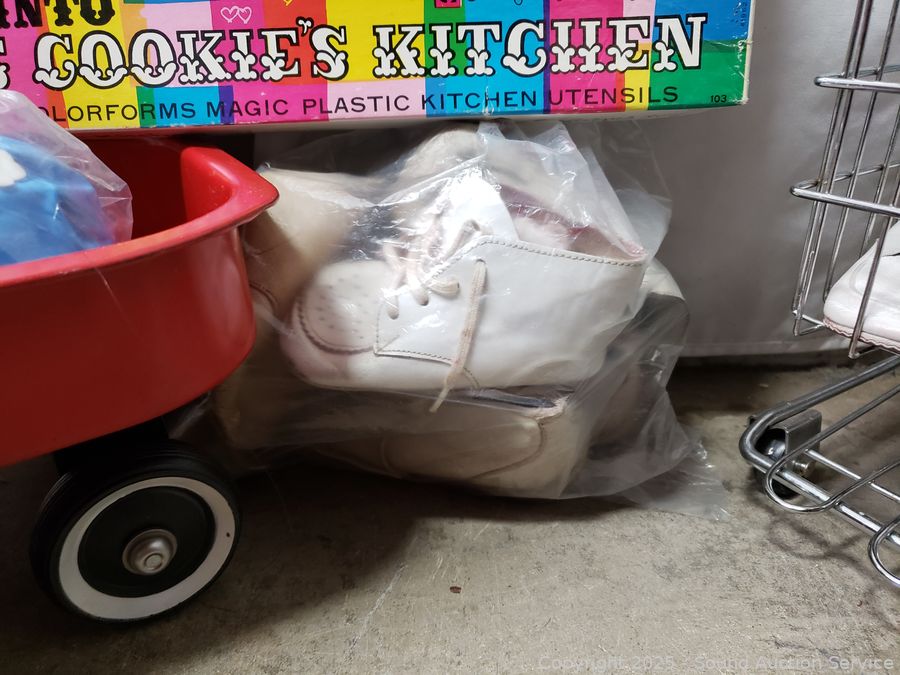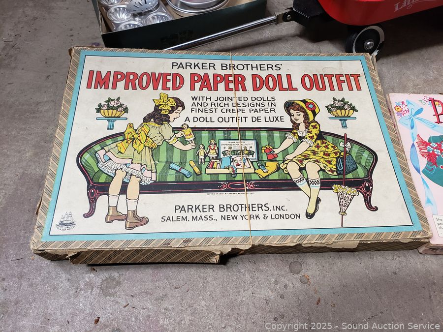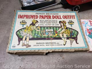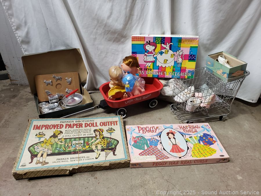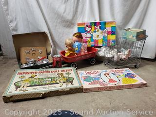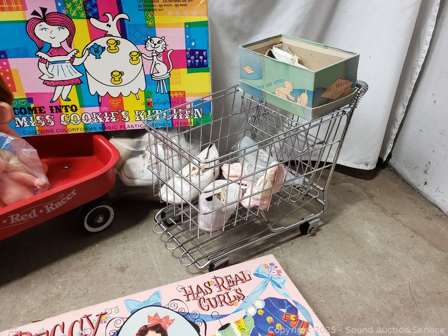 Lot #0252: Vintage Paper & Other Dolls, Baby Shoes, Doll Shopping Cart & More