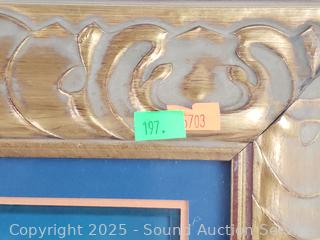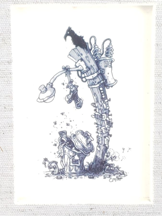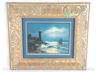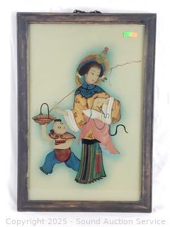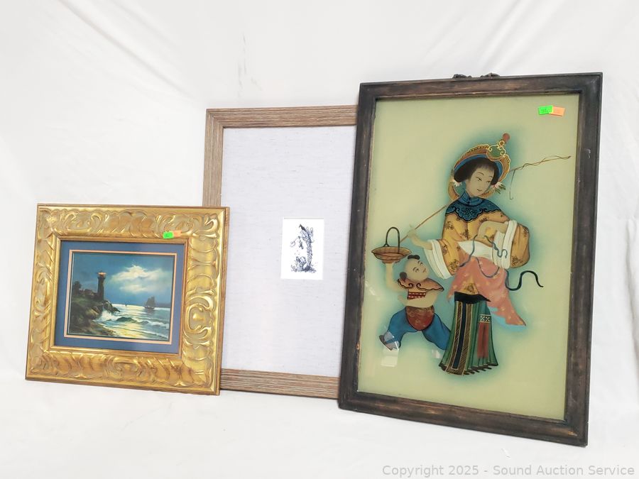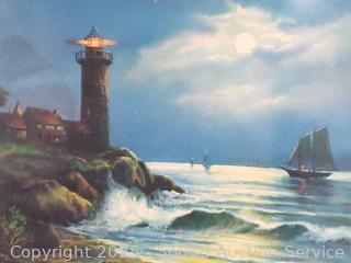 Asian painted glass, Street Light Trash Can print & Lighthouse print. Approx. 13" x 15" to 21.5" x 15".
