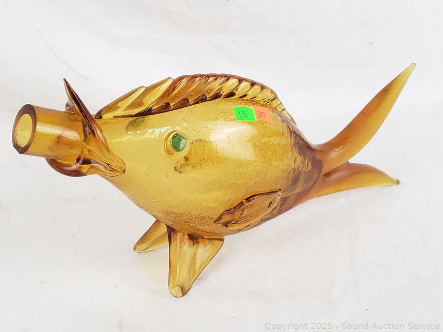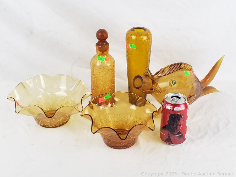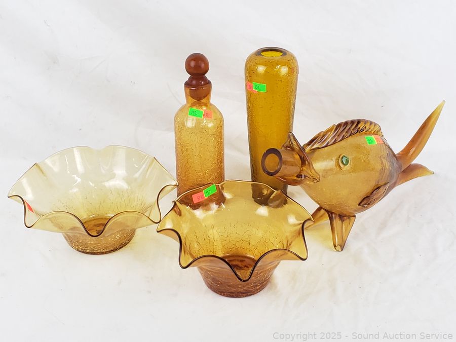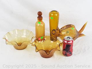 Ruffled edge bowls, fish bottle, bottle with stopper, vase. Refer to photos for lot contents, more details.