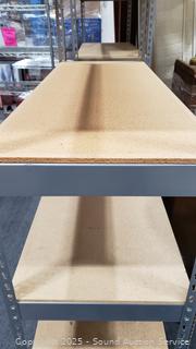 Particleboard shelves. 84" H x 48.5" W x 18.5" D. Signs of wear from use.