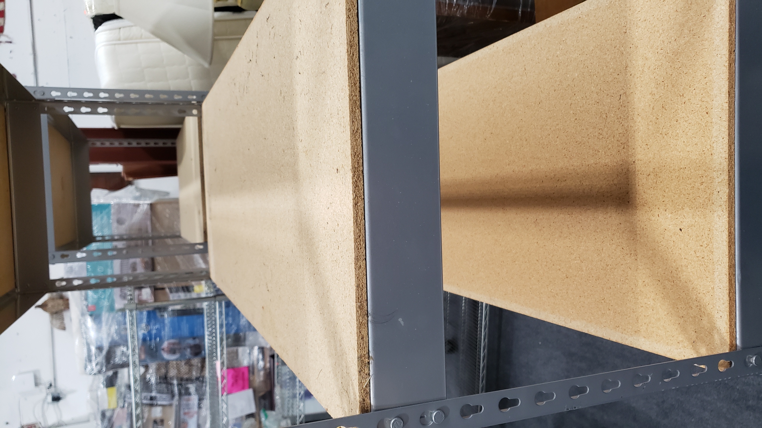 Particleboard shelves. 84" H x 48.5" W x 18.5" D. Signs of wear from use.