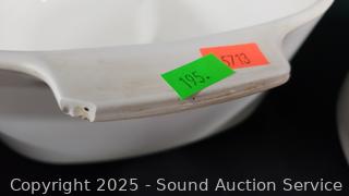1.5qt, 2" x 10" cookers, 3qt & 3L cookers (one is chipped), 10" pie pan. Refer to photos for lot contents, more details.