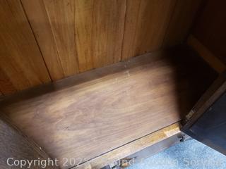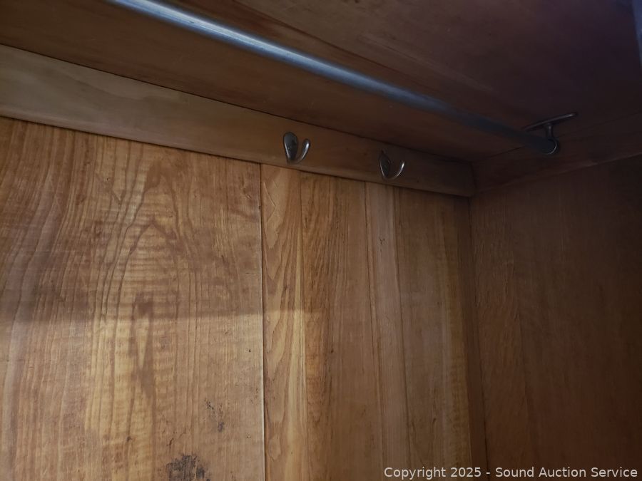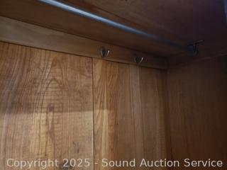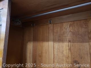 Beveled mirror, single drawer, hanging rod, hooks. Latch is handle is not opening latch properly currently taped open to keep door from locking shut, was able to pic it with a key to open. 78" H x 46" W x 17" D.