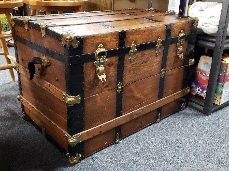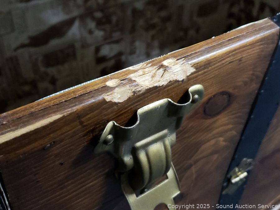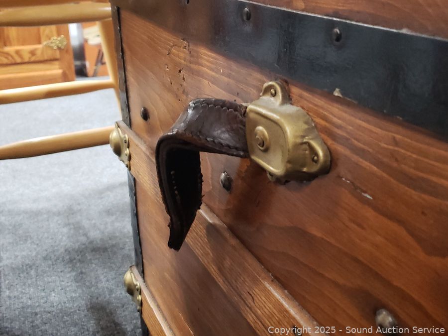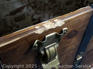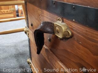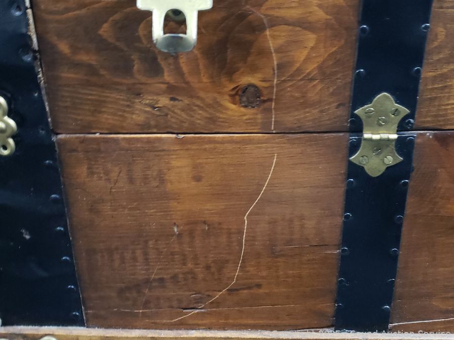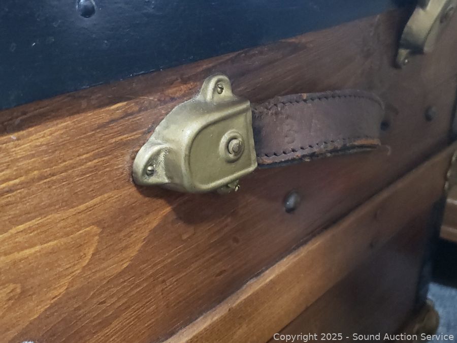 Both leather handles have some issues, one side is missing half the hardware, other the hardware has come free on one side. 24" H x 34" W x 21" D.