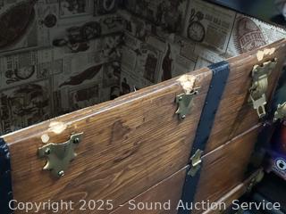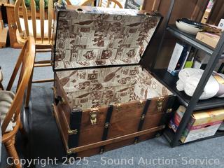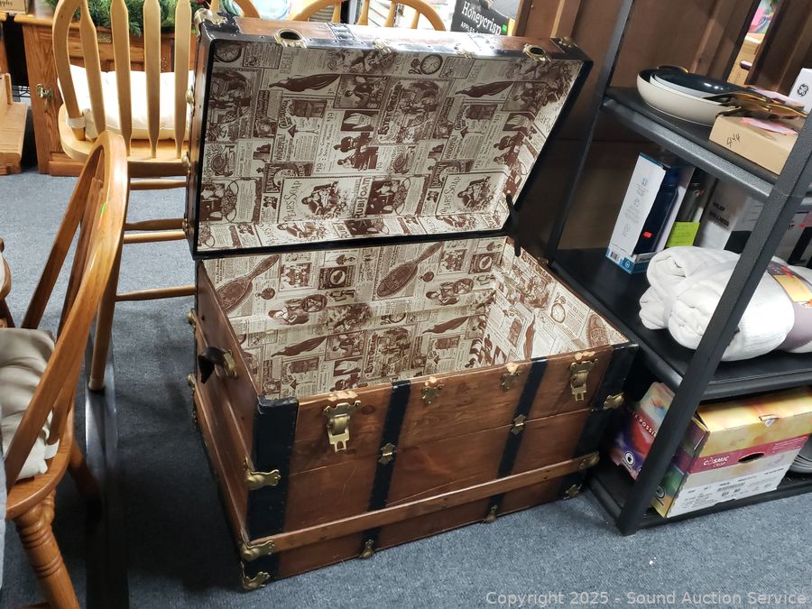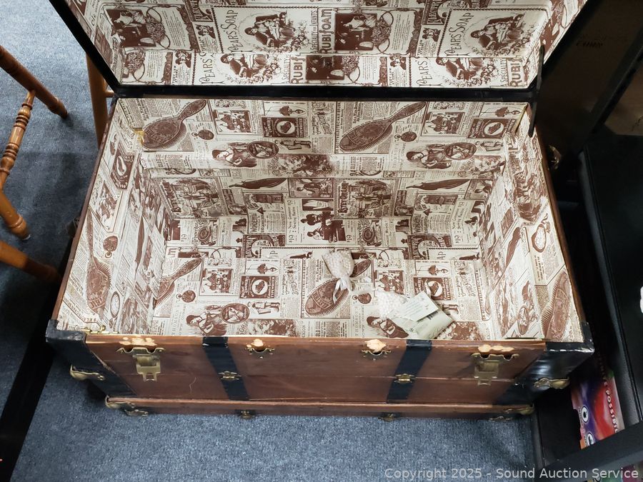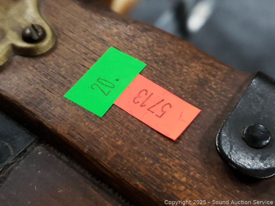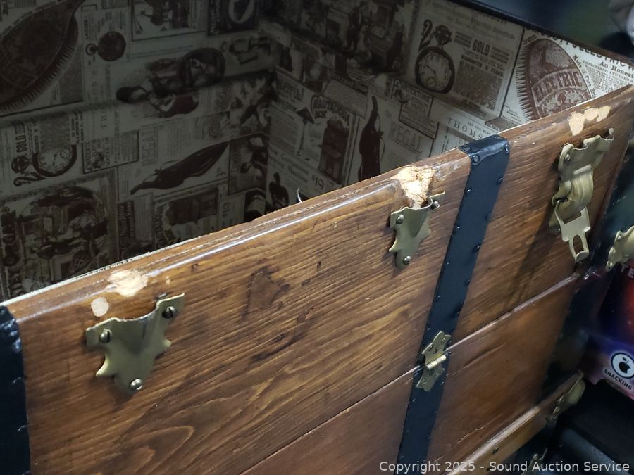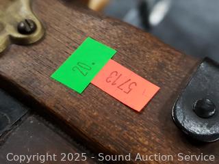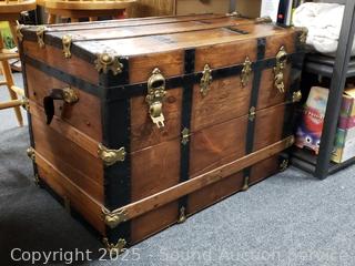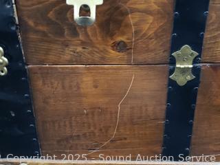 Both leather handles have some issues, one side is missing half the hardware, other the hardware has come free on one side. 24" H x 34" W x 21" D.