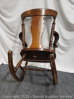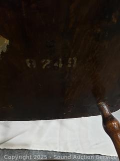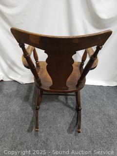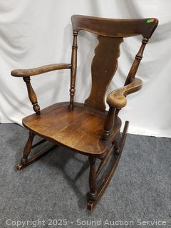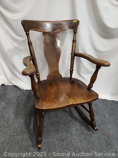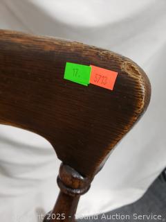 Olde patina finish, wear from age, use. 33.5" H x 24.5" W x 15.5" to seat.