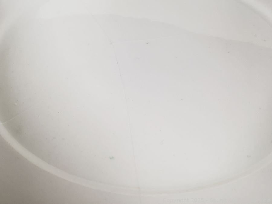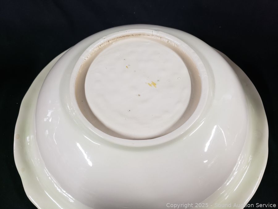 4.5" H x 16" Dia. bowl, 10" H x 9" Dia. pitcher. Don't see any major issues.
