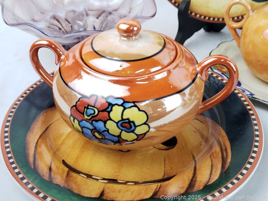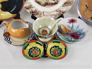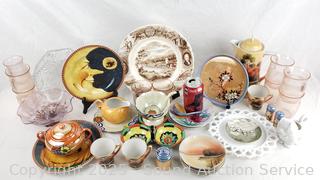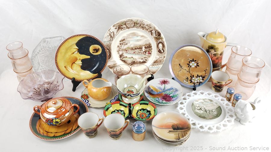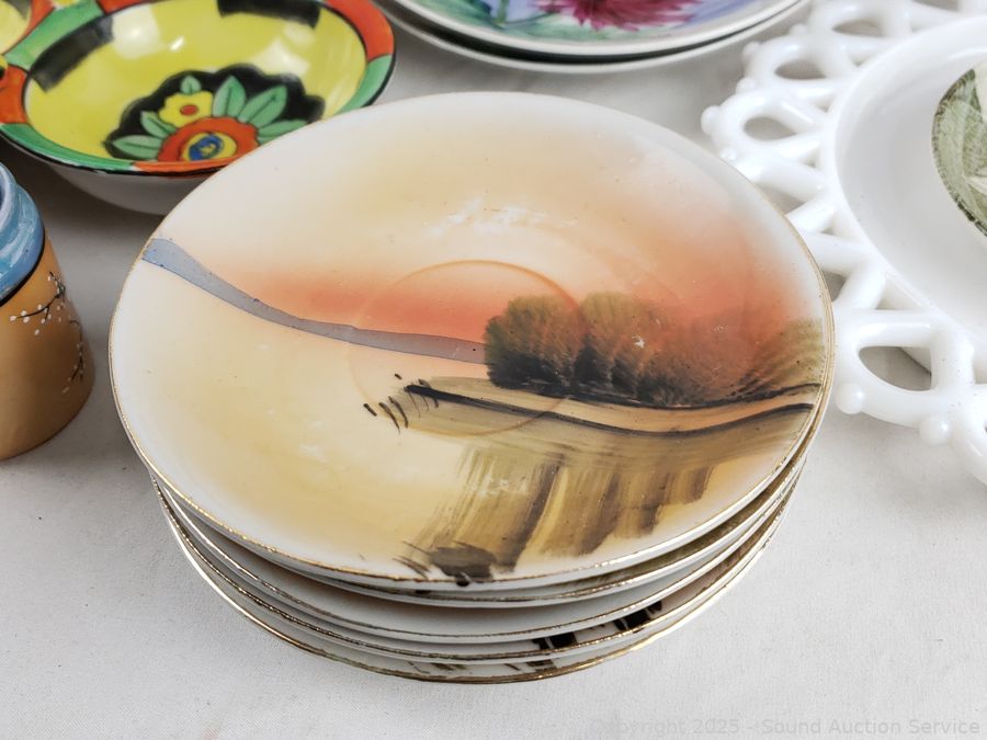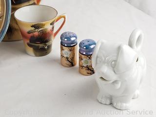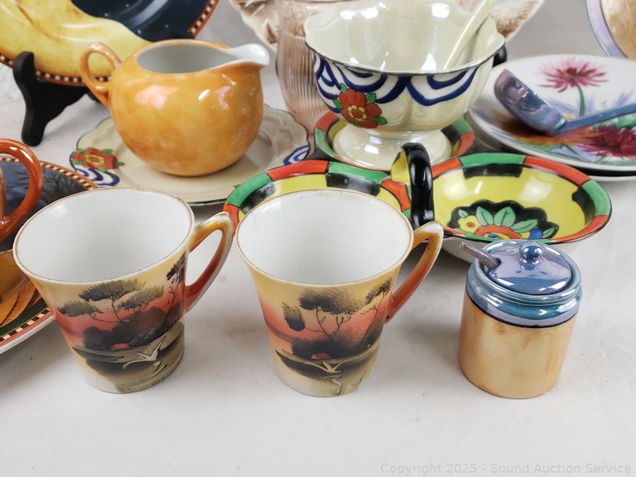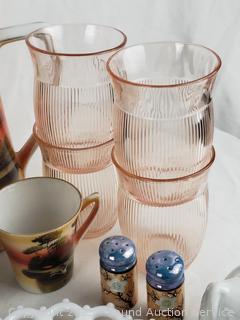 Japanese teacups, saucers, pitcher, plates, bowls, pink cups, etc. Refer to photos for lot contents, more details.