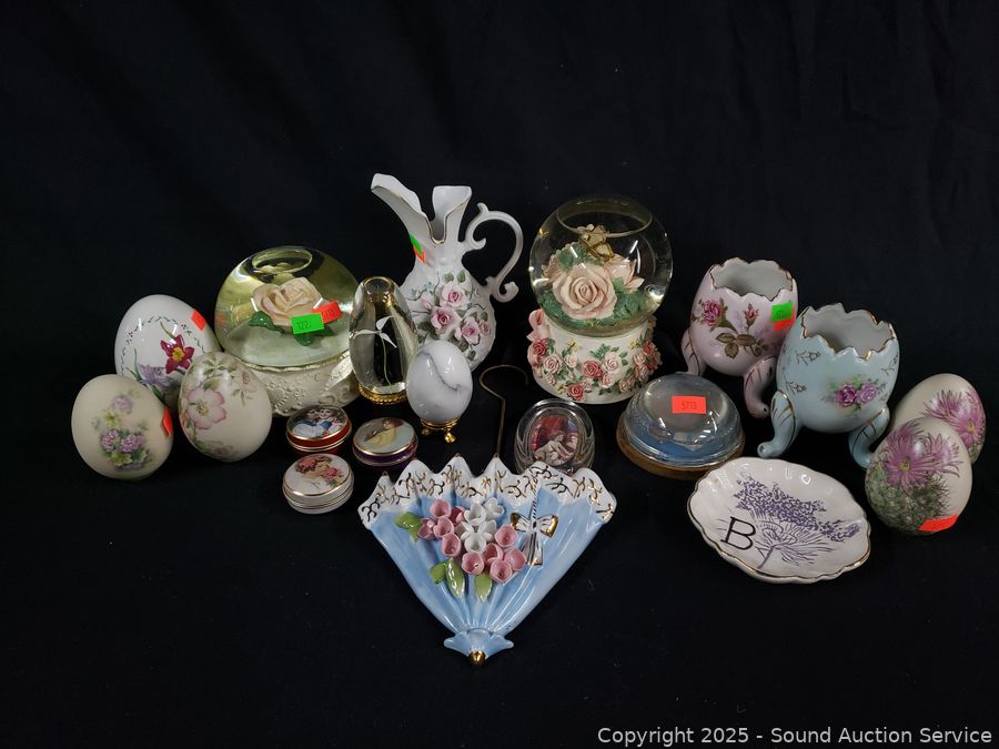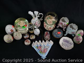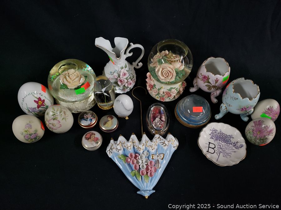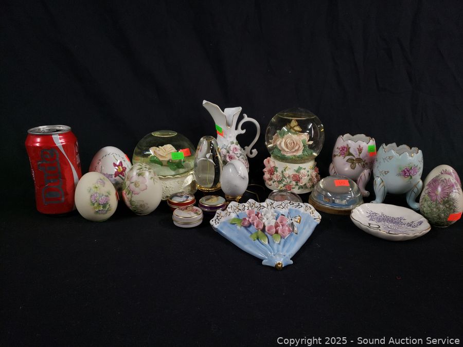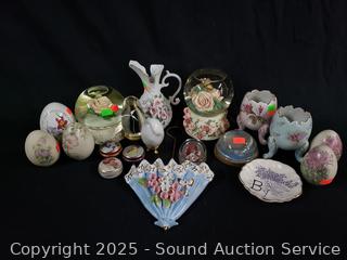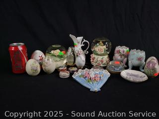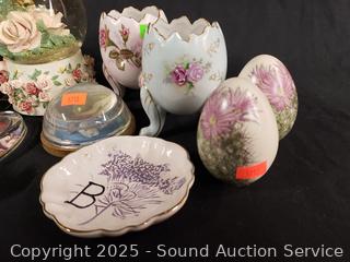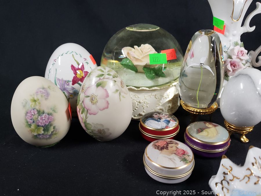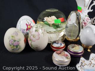 Lot #0122: Assorted Porcelain Egg Decor, Snow Globes, Tins, Paperweights