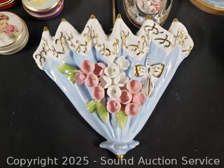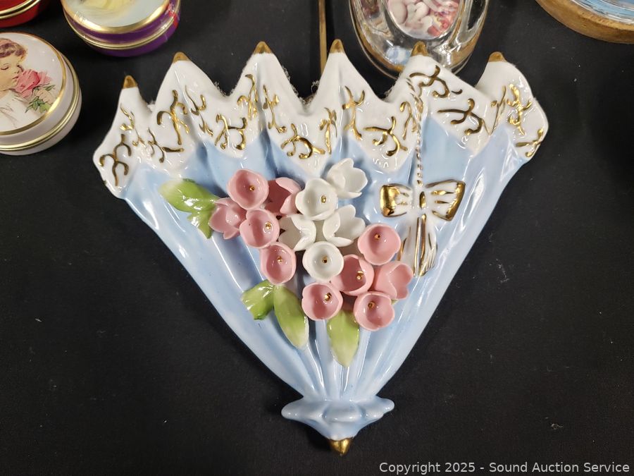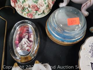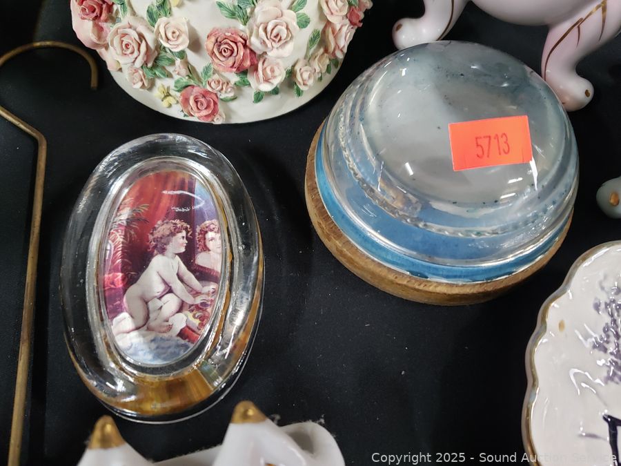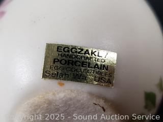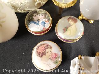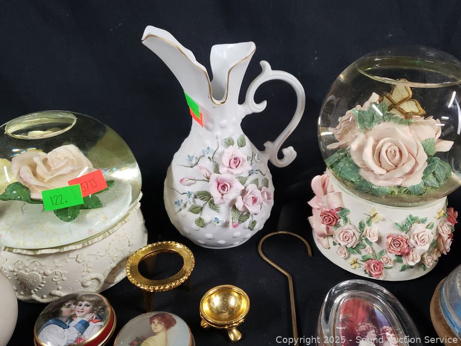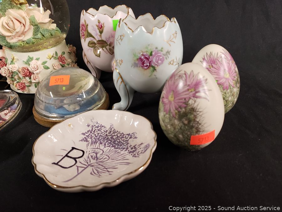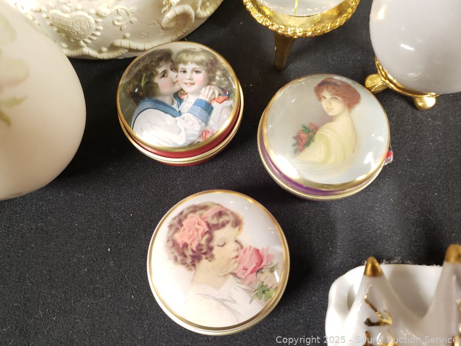 Lot #0122: Assorted Porcelain Egg Decor, Snow Globes, Tins, Paperweights